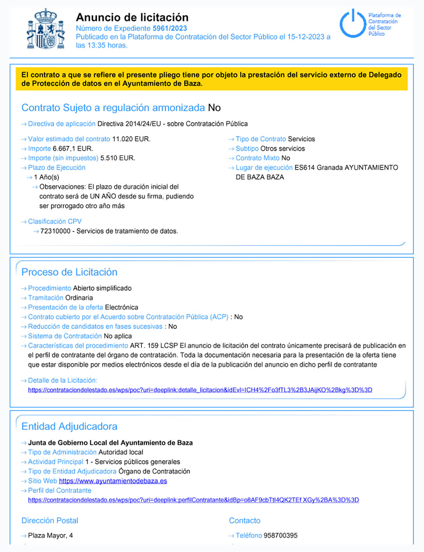En proceso de licitación el servicio externo de Delegación de Protección de Datos en el Ayuntamiento de Baza. Ya se encuentra publicado el anuncio de licitación que va a regir la contratación de un servicio externo de Delegación de Protección de Datos en el Ayuntamiento de Baza, que se realizará por procedimiento abierto simplificado.