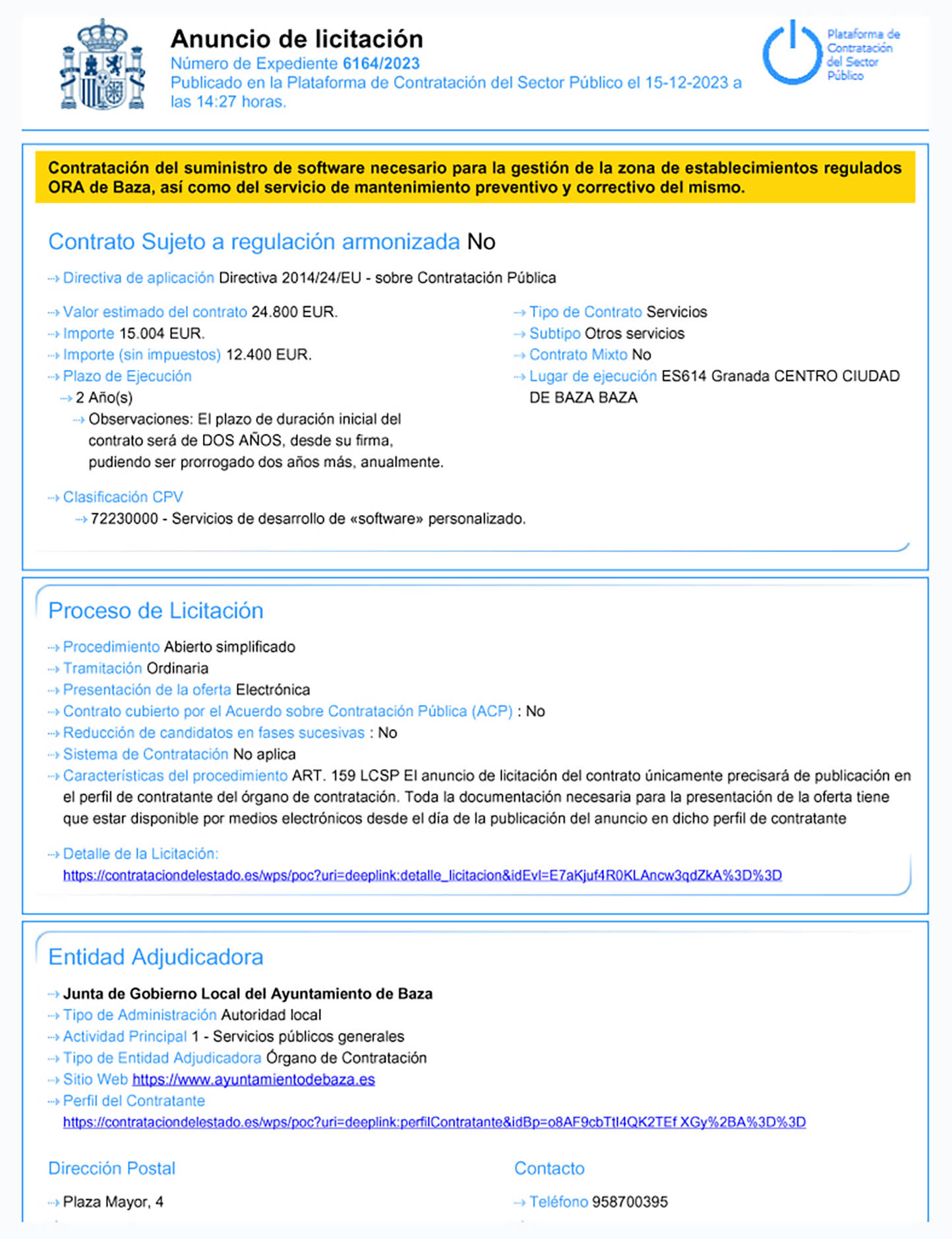 El Ayuntamiento inicia el proceso para contratar un software para la gestión de la zona ORA. El Ayuntamiento de Baza ya ha publicado el anuncio de licitación que va a regular la contratación del suministro del software necesario para la gestión de la zona de estacionamientos ORA de Baza, en el que se añade también el servicio de mantenimiento preventivo y correctivo del mismo, ambos por procedimiento abierto simplificado. El presupuesto base de licitación es de 15.004 euros (IVA incluido) y las ofertas podrán presentarse hasta el día 30 de diciembre de 2023.