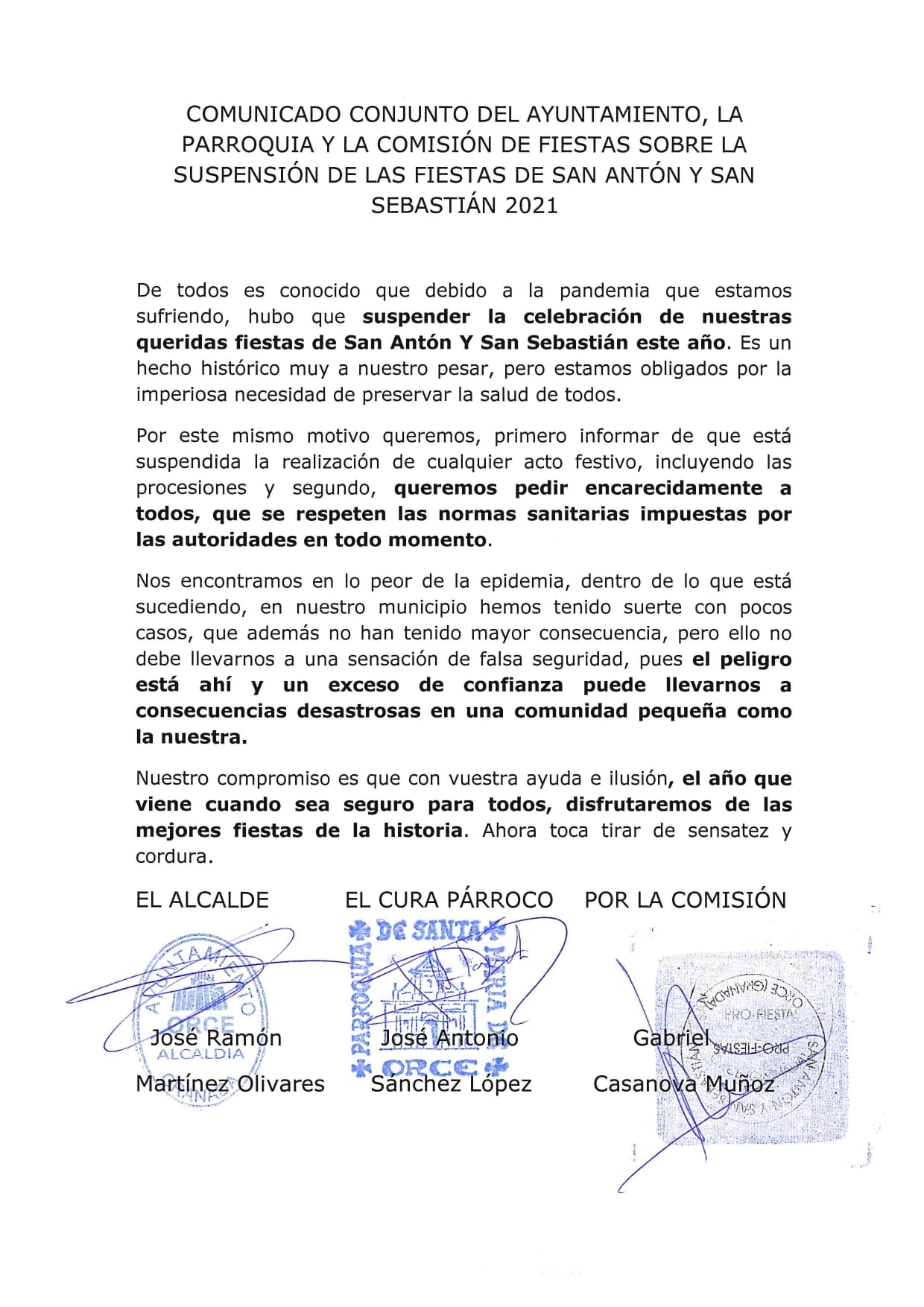 El alcalde de La Puebla, Mariano García Castillo, indicaba que toda precaución es poca en la lucha contra el Covid 19 y, aunque en la actualidad el municipio tiene tasa de incidencia cero, el primer edil recuerda lo mal que lo pasaron el verano pasado, cuando surgió un brote que aconsejó el confinamiento voluntario de los vecinos. La semana pasada el Ayuntamiento contrató los servicios de una empresa especializada para desinfectar los colegios y se mantiene alerta en su lucha contra la pandemia. Otras localidades como Huéscar, Orce y Caniles también han prohibido la celebración de las fiestas de San Antón y San Sebastián.