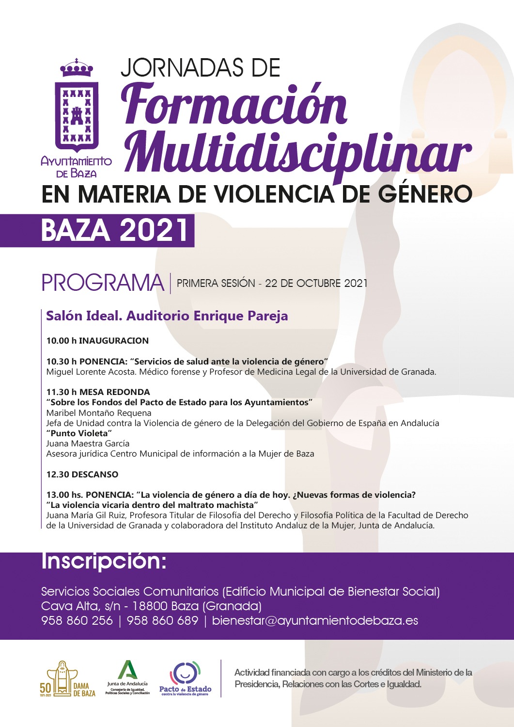 Miguel Lorente, entre los ponentes de la primera sesión del programa Jornadas de Formación Multidisciplinar en Materia de Violencia de Género. El Ayuntamiento de Baza, desde el área de Igualdad, Bienestar Social y Mujer, ha diseñado un programa de formación y sensibilización social en materia de violencia de género que se abordará desde diferentes perspectivas: jurídica, policial, psicológica, social y sanitaria. Este programa formativo se desarrollará en distintas sesiones que se distribuirán a lo largo de varios meses desde su inicio este viernes 22 de octubre hasta su culminación en marzo de 2022.