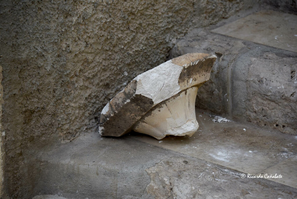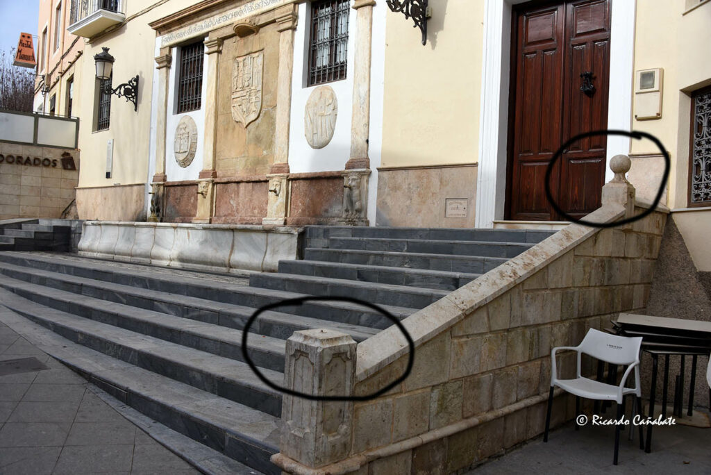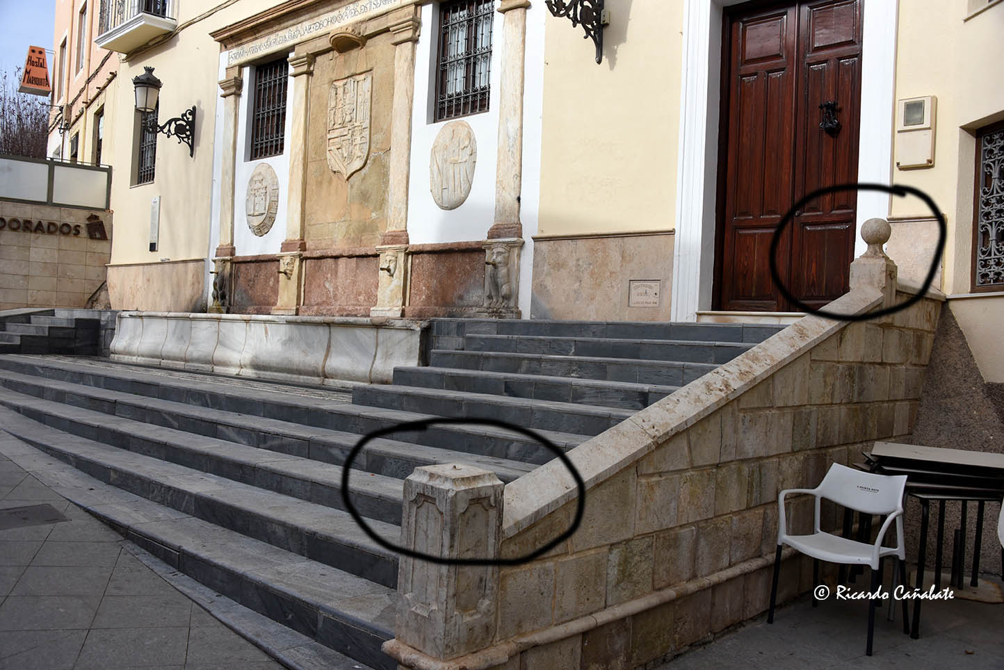 En el inicio de las escaleras de subida a la calle Aduana, se encontraba tirada lo que podía parecer la basa de una columna, algo que de por sí llamaba la atención, si bien la incógnita se despejaba en buena parte, al girar hacia los Caños Dorados, donde saltaba a la vista el destrozo realizado al inicio de la estructura y había huellas evidentes de que los vándalos de turno habían arrancado la parte esférica que remataba el pequeño muro que protege el entorno del antiguo abrevadero, en lo que era una estructura similar a la que se encuentra en la zona superior de ese mismo lado.