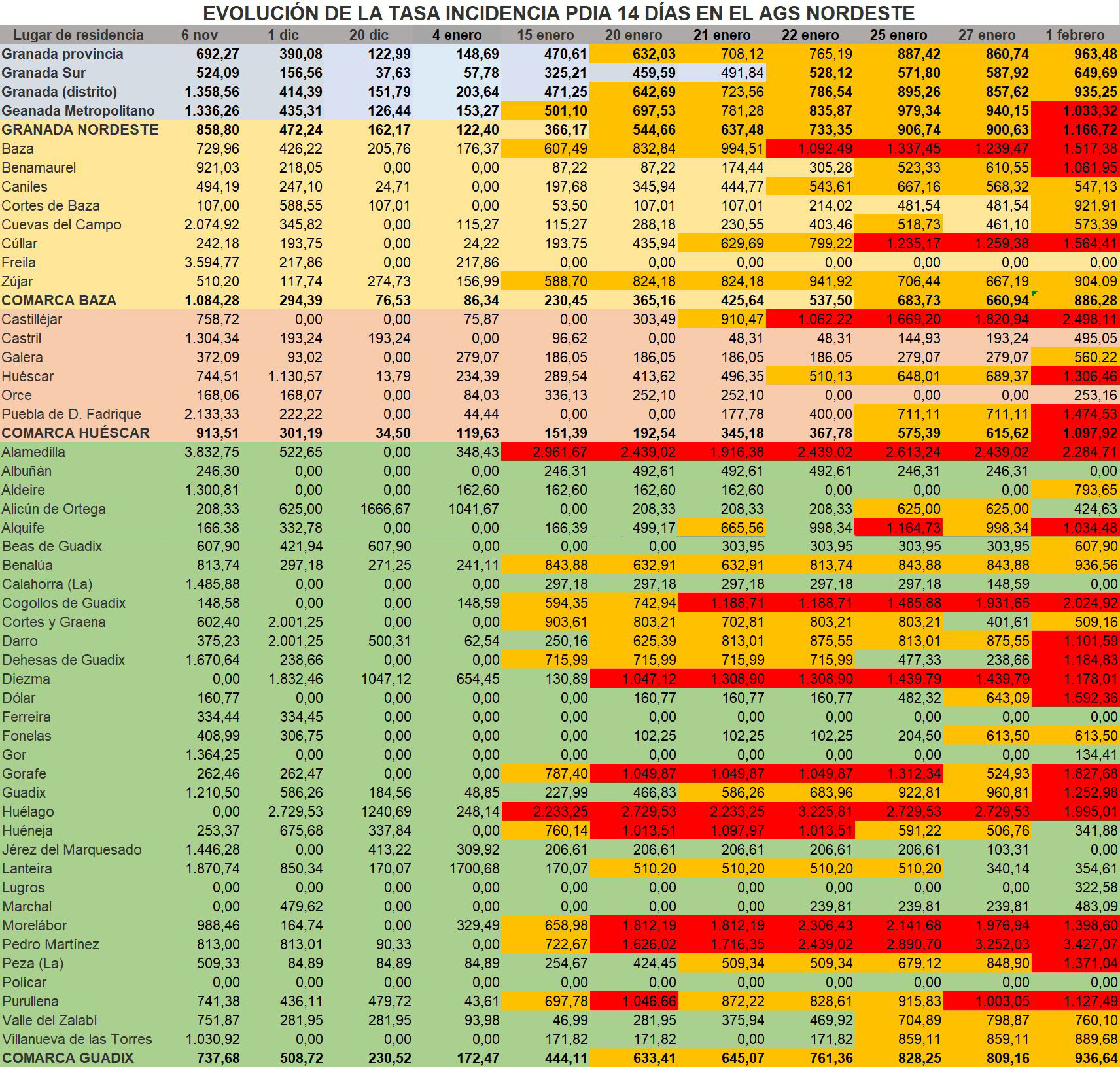 Destacable también la subida que se ha producido en las tasas de incidencia, conforme se puede apreciar en la tabla insertada al principio de este Noticiario, previa a la cita de hoy con el Comité Provincial de Alertas, que se reúne esta tarde y, poco nos equivocaremos, con trabajo para aumentar las restricciones en unos cuantos municipios de nuestra provincia.