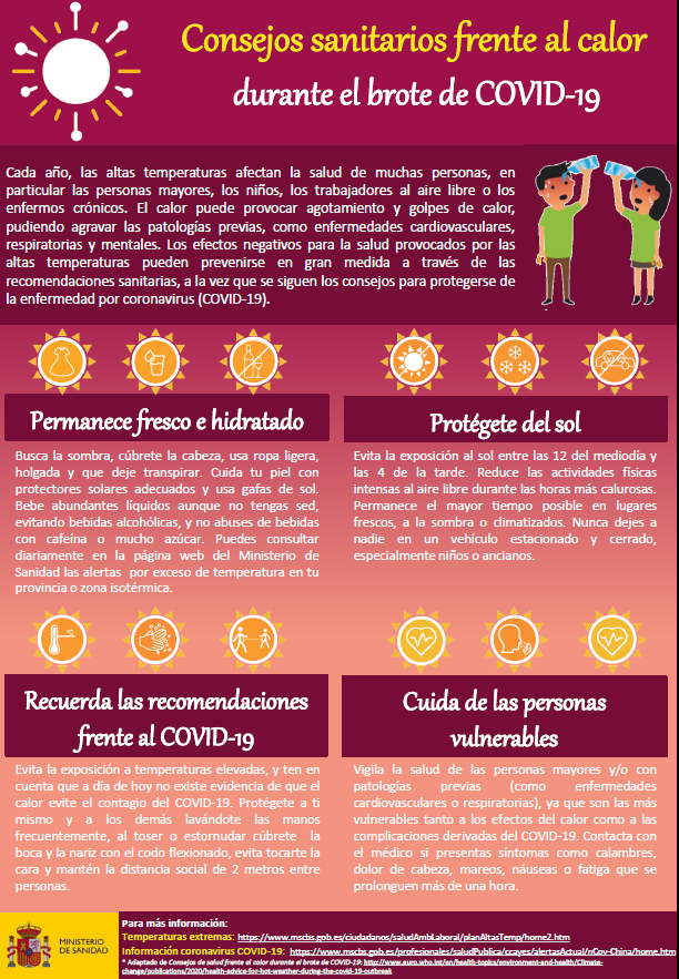 Sanidad activa el Plan Nacional de Acciones Preventivas contra los Efectos del Exceso de Temperaturas. El Plan permanecerá activado desde el 1 de junio hasta el próximo 15 de septiembre. Además existe un seguimiento en los quince días previos y el mes posterior a este periodo para el caso de que fuera necesaria una activación del Plan Nacional debido a unas temperaturas anormalmente elevadas que requieran una activación previa o una reactivación del Plan.
