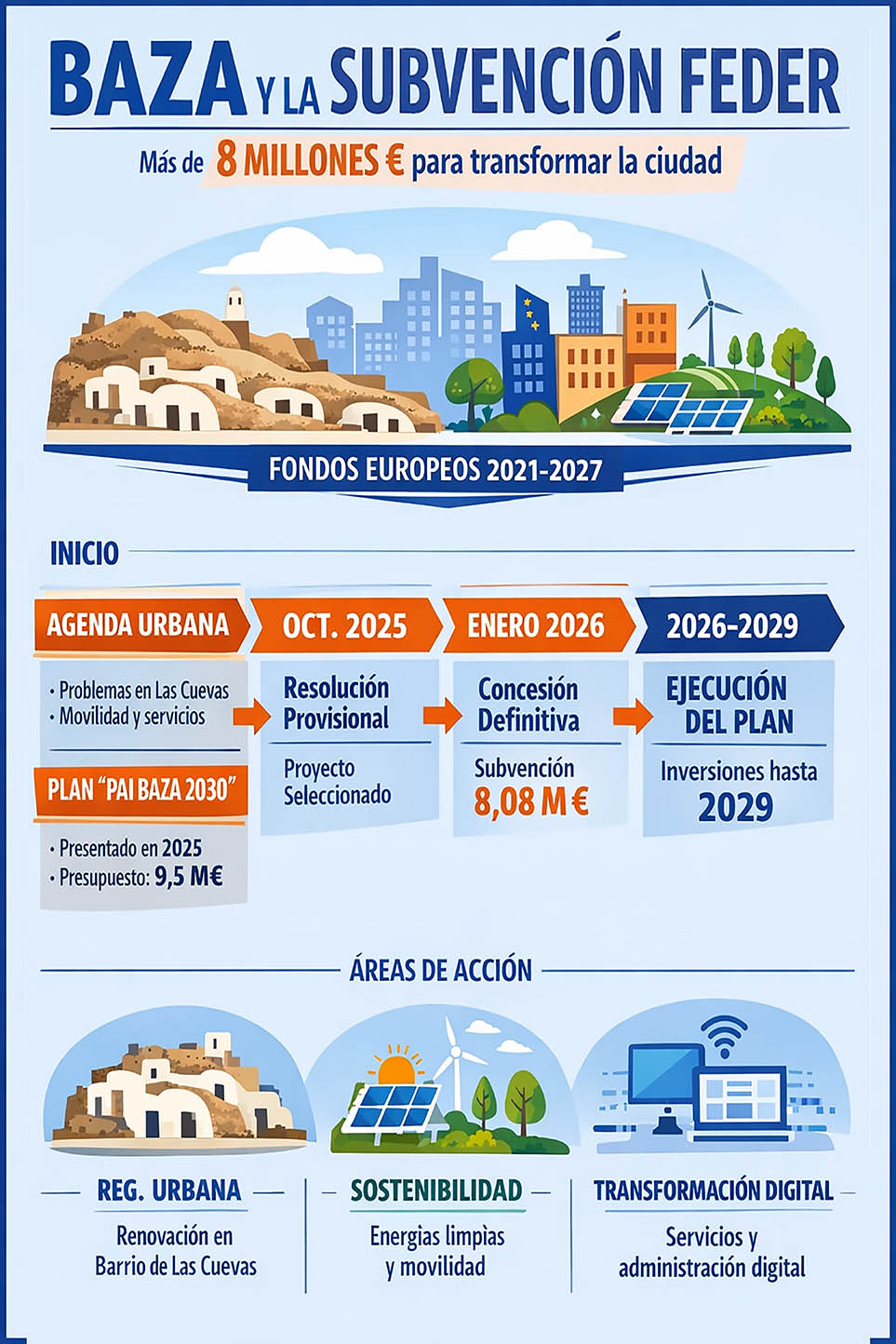 Confirmada la concesión de más de 8 millones de euros de fondos FEDER para inversiones en Baza. La ciudad de Baza ha recibido de forma definitiva una subvención de 8.081.309 euros procedente de los fondos FEDER, destinada a financiar un amplio conjunto de inversiones municipales durante los próximos años. La confirmación oficial se produjo el 16 de enero, tras la publicación de la resolución definitiva de la convocatoria correspondiente al periodo 2021-2027.