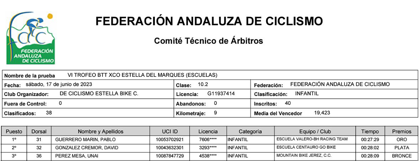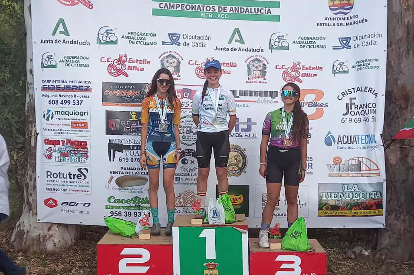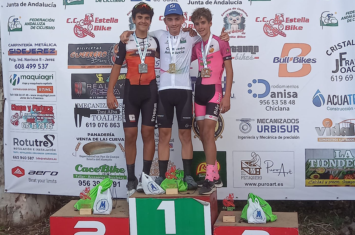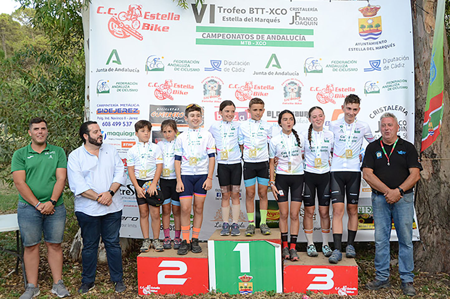 Nuevos éxitos de los jóvenes ciclistas bastetanos de la Escuela David Valero, con dos oros en los campeonatos andaluces de Escuelas BTT de Estella del Marqués. La entidad local autónoma de Estella del Marqués, en Jerez de la Frontera (Cádiz), vivió el pasado fin de semana una sesión vespertina muy divertida y competida con las categorías de escuelas en liza luchando por los títulos de campeones andaluces de la modalidad olímpica del BTT. Este Campeonato de Andalucía de BTT Escuelas 2023, organizado por el Club de Ciclismo Estella Bike, con la colaboración de la Federación Andaluza de Ciclismo (FAC), congregó alrededor de 170 jóvenes deportistas que, venidos desde distintos puntos de la geografía andaluza, acudieron con las mayores ilusiones a esta importante cita.