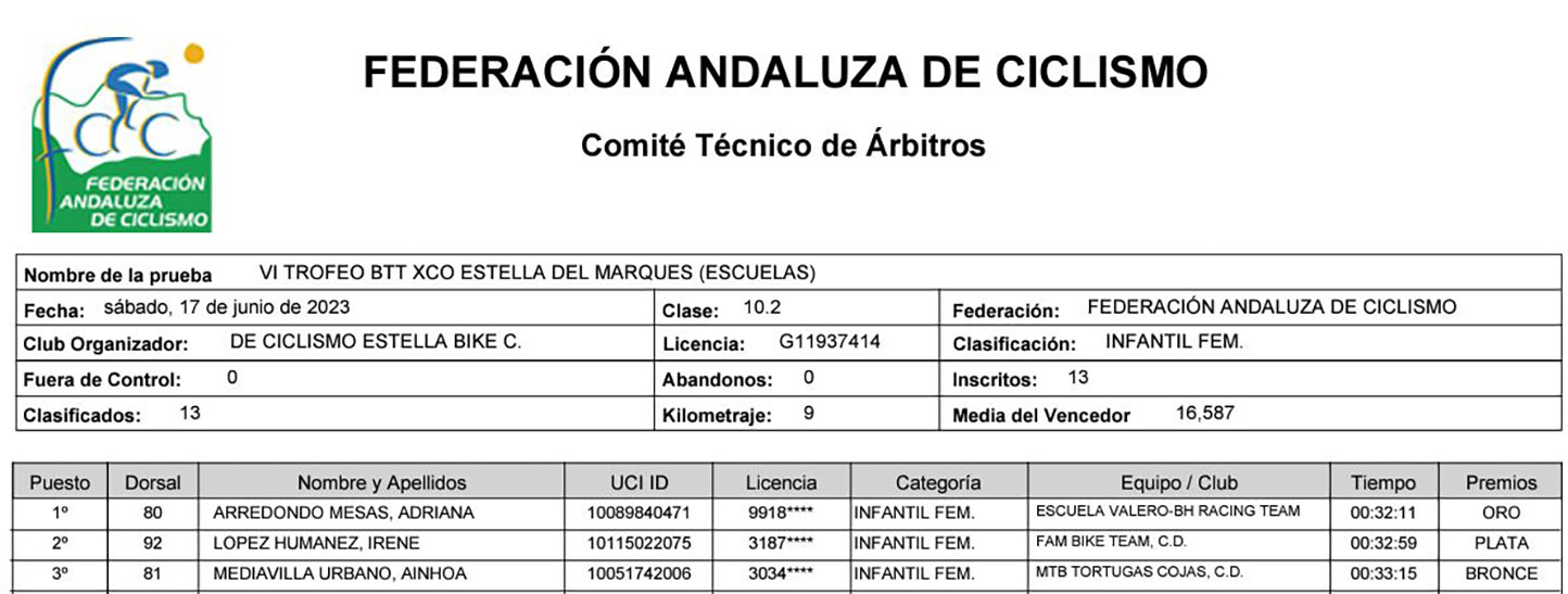 Y el broche de oro lo pusieron los chicos y chicas de categoría infantil, quienes tuvieron que completar 4 vueltas. La destreza y habilidad de los participantes se puso en juego, con preciosas y espectaculares imágenes en lugares como el ‘rock garden’, zonas de salto o peraltadas. En los chicos un grupo completó juntos los primeros giros, pero en la penúltima vuelta la carrera se rompió en favor de un fortísimo Pablo Guerrero (Escuela Valero-BH Racing Team) que marcó un demoledor ritmo que tuvo respuesta en sus rivales y que le llevó en volandas hacia el oro. Y en chicas, vuelta a vuelta, la compañera de equipo del ganador, Adriana Arredondo (Escuela Valero-BH Racing Team), fue dejando atrás a sus oponentes para cruzar primera la línea de meta y adjudicarse un merecido oro que se fue para la localidad granadina de Baza.