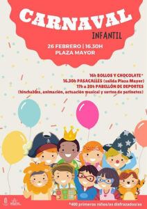 El Infantil Carnaval Infantil dará comienzo a las cuatro de la tarde en la Plaza Mayor con la entrega de bollos y chocolate a los 400 primeros niños y niñas que lleguen disfrazados. Habrá a continuación un pasacalles y, de cinco a ocho de la tarde, se organizarán actividades en el Pabellón de Deportes con hinchables, animación, actuación musical y sorteo de patinetes.