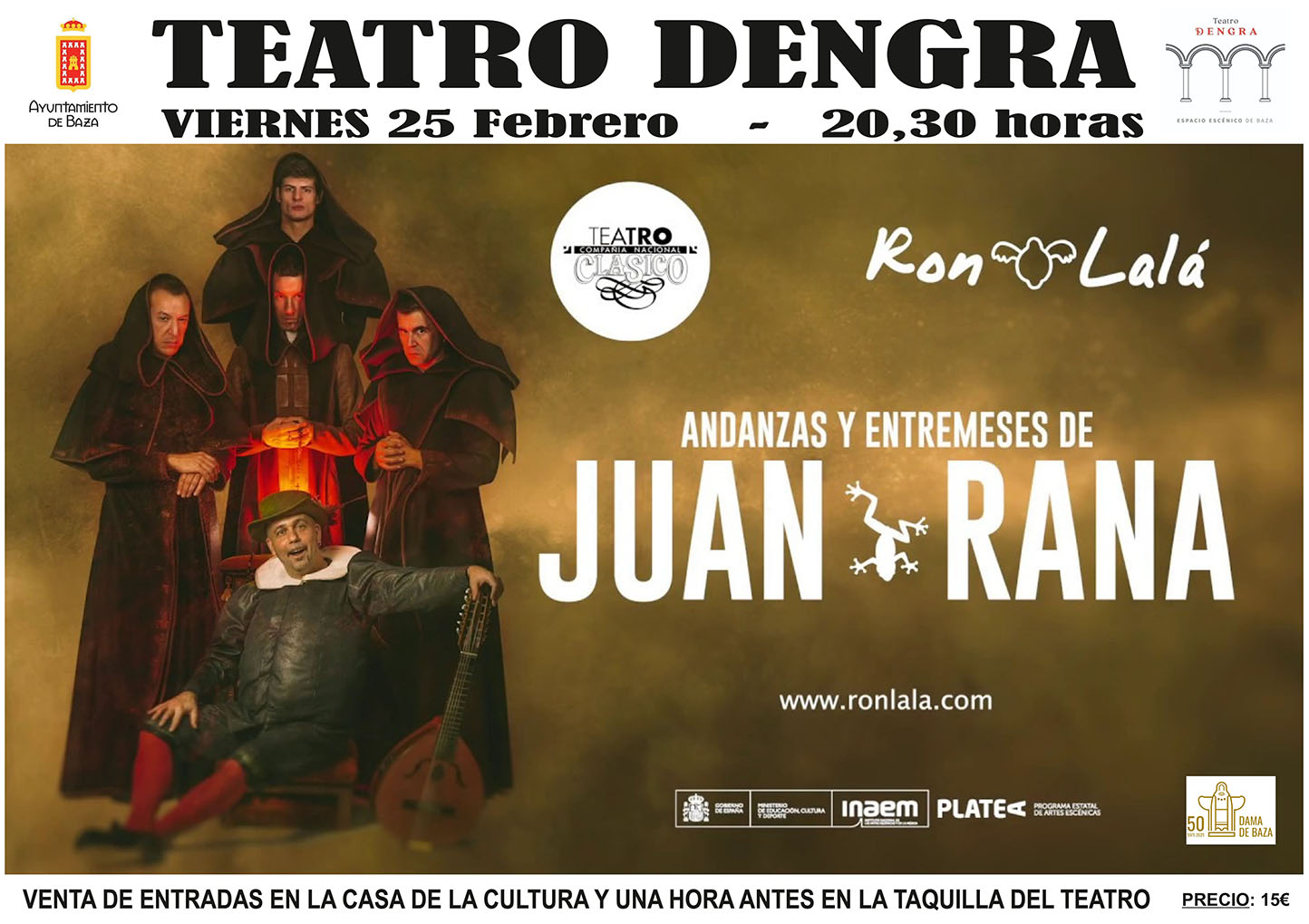 El Programa Platea trae este viernes al Dengra «Andanzas y Entremeses de Juan Rana», finalista de los Premios Max de las Artes Escénicas 2021. Todavía se pueden comprar de forma anticipada, en la Casa de la Cultura, las entradas anticipadas para «Andanzas y Entremeses de Juan Rana», una producción de la Compañía Nacional de Teatro Clásico y de Ron Lalá, que llega al Dengra este viernes 25 de febrero de la mano del Programa Estatal de Artes Escénicas Platea, al que se ha adherido el Ayuntamiento de Baza. Una ocasión única para disfrutar en Baza de este obra Finalista de los Premios Max 2021 Mejor Adaptación/ Versión (Álvaro Tato) y Mejor Vestuario (Tatiana de Sarabia).