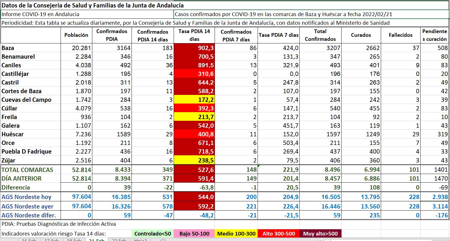Parecido comportamiento el de las comarcas de Baza y Huéscar, con 39 contagios nuevos y con la tasa de incidencia a 7 días que sube 20,5 puntos y se sitúa en 221,9, mientras que a 14 días la bajada es notable, con un descenso de 63,8 casos y un valor de 527,6. Destacar también que se contabilizaron 101 curados, con los que la cifra total baja hasta los 1.401 y todo ello sin que se registrara ningún fallecimiento en ninguna de las tres comarcas del norte granadino.