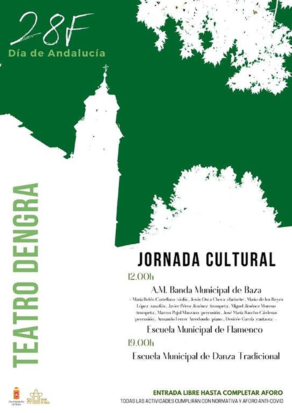 Música para celebrar el Día de Andalucía, el lunes 28 de febrero, en el Teatro Dengra. El Día de Andalucía se celebrará en Baza con una completa jornada cultural que arrancará a las doce del mediodía del mismo lunes 28 de febrero en el Teatro Dengra.