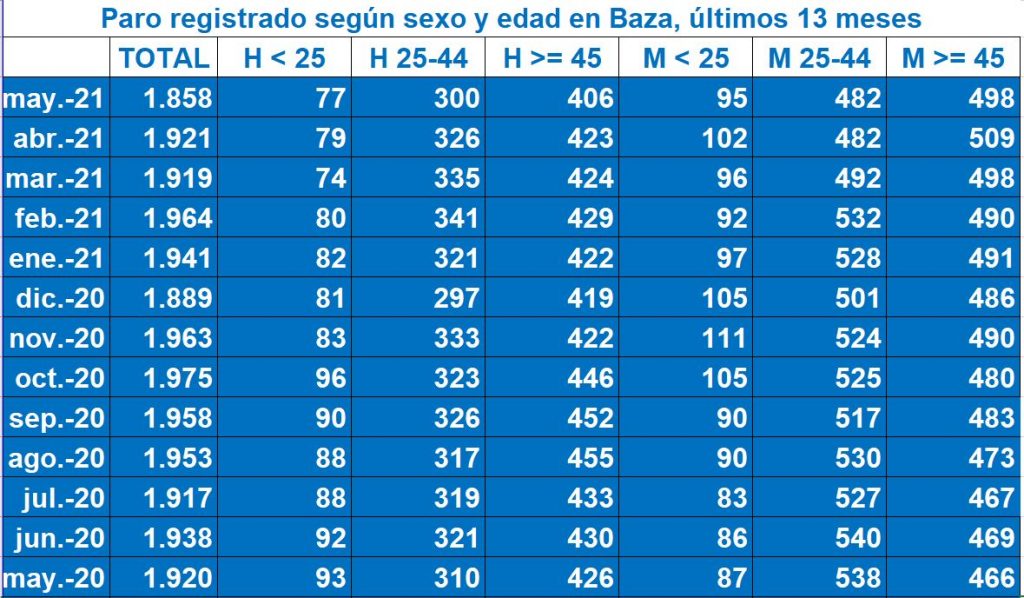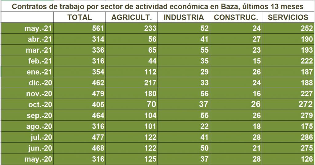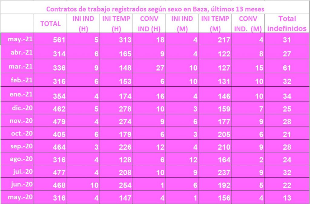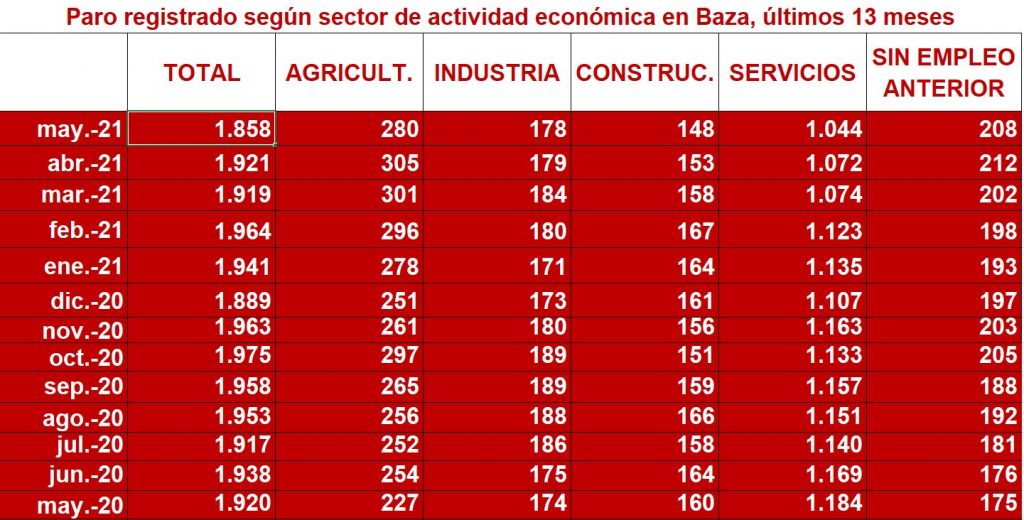 Baza registra a finales de mayo la mayor bajada de las cifras de paro de los últimos meses, situándose a niveles comparables a los de antes de la pandemia. A nivel general, la evolución del paro en nuestro país, en valores relativos, supone un descenso del paro registrado es del 3,31%, después de que en el mes de mayo se ha registrado la mayor caída del desempleo de la serie histórica que comienza en 1996.