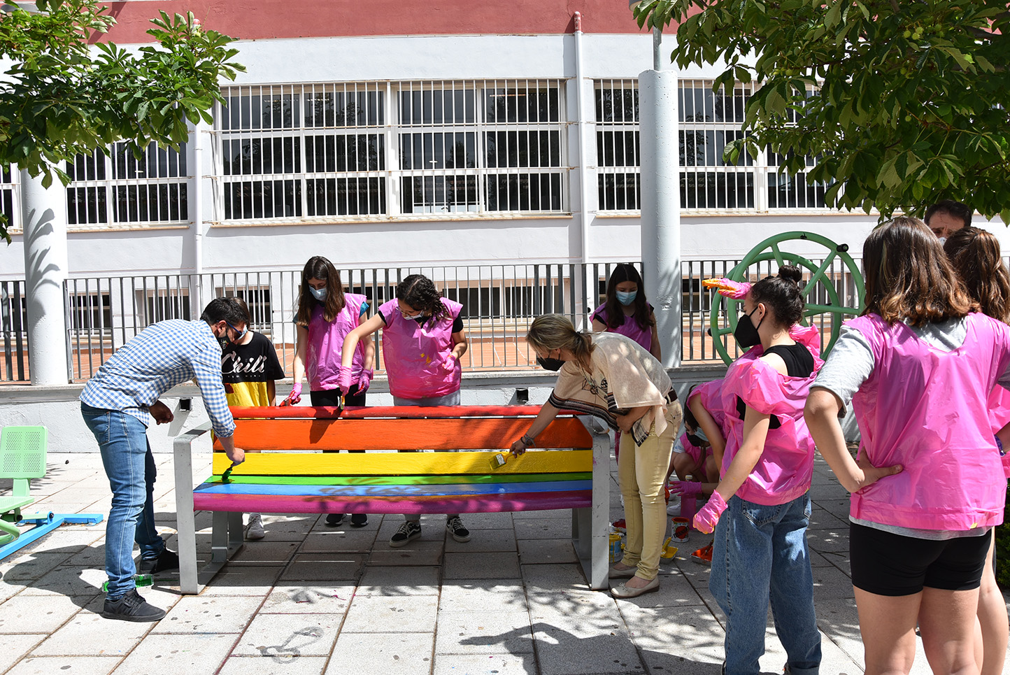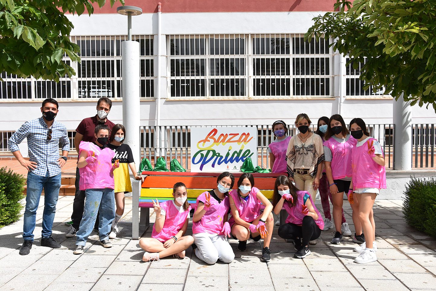 Pinturas arcoíris y decoración multicolor en la ciudad con motivo de ‘Baza Pride 2021, 10 días de orgullo’. La ciudad de Baza se llena de color estos días con motivo de la celebración ‘Baza Pride 2021, 10 días de orgullo’, una completa programación diseñada con motivo del Día del Orgullo LGBTI + que se celebra cada año el 28 de junio. Una de las actividades consiste en pintar con los colores arcoíris algunos elementos del mobiliario urbano, como los bancos cercanos al Pabellón Municipal de Deportes; esta iniciativa se desarrolla en el marco del proyecto ‘Cantera’ que se lleva a cabo con el apoyo de la Junta y en colaboración con los centros educativos y no quisieron perdérsela los concejales de Juventud y de Bienestar Social, Antonio Vallejo y Mariana Palma. Desde ayer lunes 21 de junio se inicia también la decoración multicolor de las calles y establecimientos, tomando este año como elemento transversal la celebración del 50 Aniversario del Descubrimiento de la Dama de Baza.