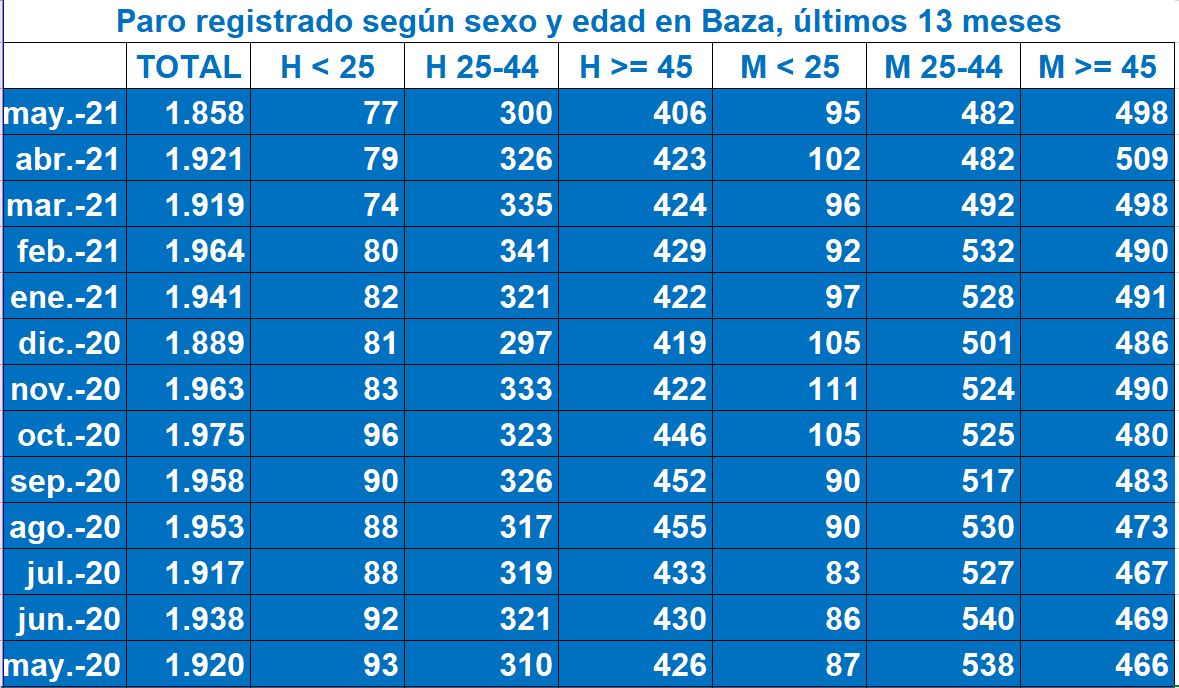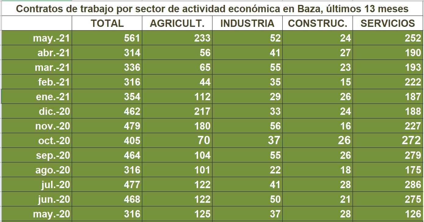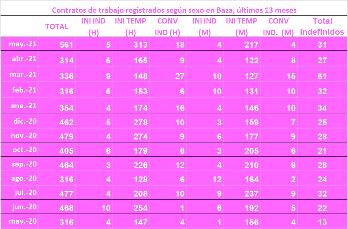 Baza registra a finales de mayo la mayor bajada de las cifras de paro de los últimos meses, situándose a niveles comparables a los de antes de la pandemia. A nivel general, la evolución del paro en nuestro país, en valores relativos, supone un descenso del paro registrado es del 3,31%, después de que en el mes de mayo se ha registrado la mayor caída del desempleo de la serie histórica que comienza en 1996.