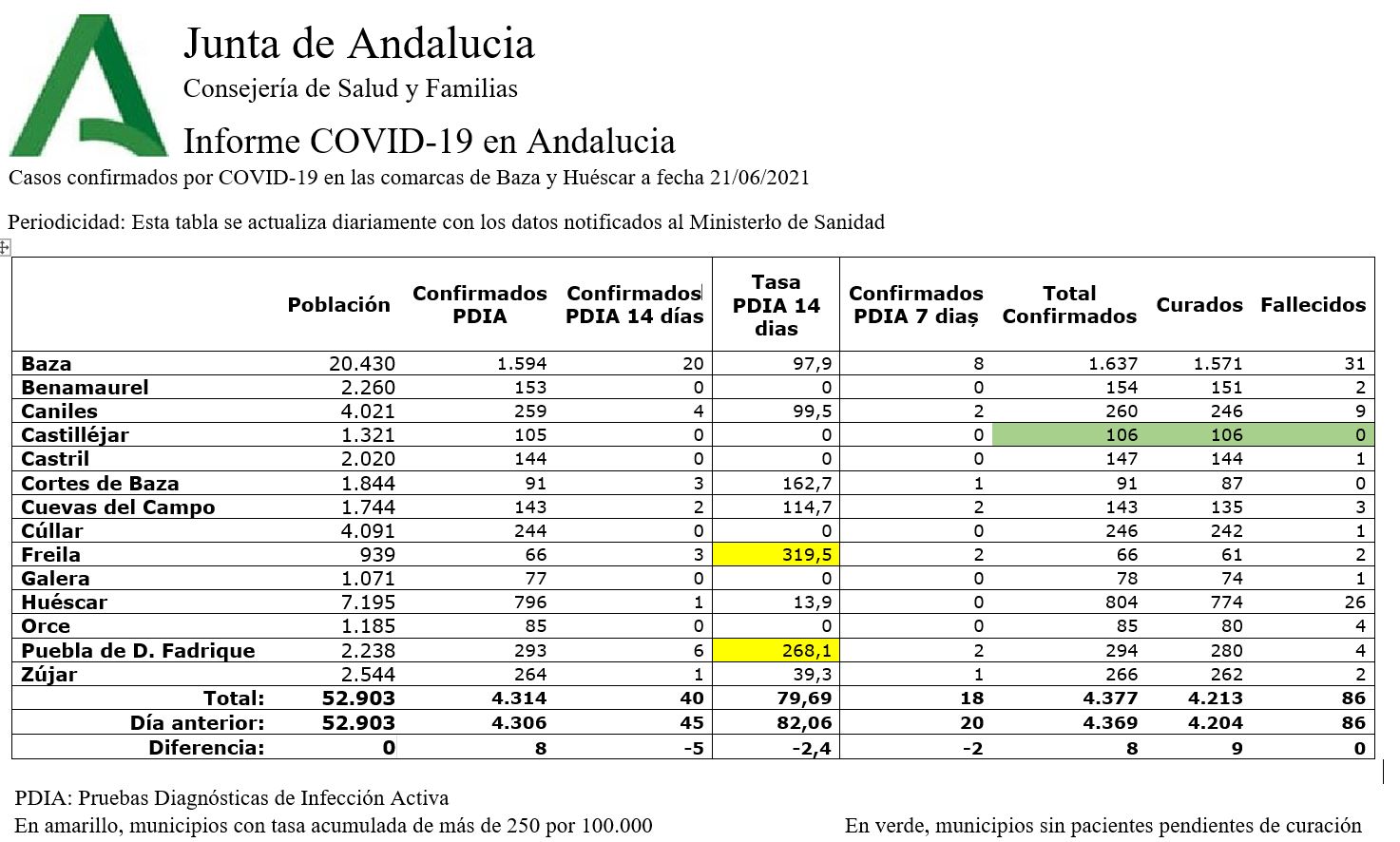 Y por lo que se refiere a los datos de la Consejería de Salud para esta misma semana, en la comarca de Baza y Huéscar ha mejorado la situación en cuanto a los confirmados en los últimos 7 y q4 días, mientras que los curados volvían a ser más que las personas confirmadas y se mantenía inalterable las cifras de fallecidos en todos los municipios de Huéscar y Baza, tal y como puede verse en la tabla que adjuntamos a esta noticia.