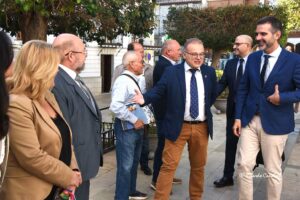 El Consejero de Agricultura hacía ayer una parada en Baza para realizar una visita institucional y estrechar lazos de colaboración con el Ayuntamiento bastetano. Una visita que se iniciaba con la recepción del consejero de Agricultura, Pesca, Agua y Desarrollo Rural, Fernández-Pacheco, en la Plaza Mayor, donde fue recepcionado por el Equipo e Gobierno, tras lo que atendió a los medios locales en la puerta de la Casa Consistorial y dio paso a la salutación pública del alcalde bastetano. El consejero llegaba a la ciudad bastetana acompañado por el Secretario General de Agricultura de la Junta, Manuel Gómez; el delegado del Gobierno de la Junta en Granada, Antonio Granados; y la delegada territorial de Agricultura, Carmen Lidia Reyes, y otras personas de su equipo.