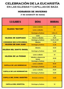 Una información que nos llega por cortesía del párroco Manuel Millán, de la Iglesia Mayor, y que hace referencia a las celebraciones que se realizan en las diferentes iglesias y parroquias de la ciudad, así como en el resto de capillas que están abiertas al culto, entre las que destacamos la de las Madres Dominicas, en su convento de la Ronda de Baza; las Hermanitas, en la calle Sor Matilde; Divino Maestro, en la calle Fuente de San Juan y en la capilla del Hospital Comarcal de Baza, que se encuentra en la primera planta de este centro sanitario.