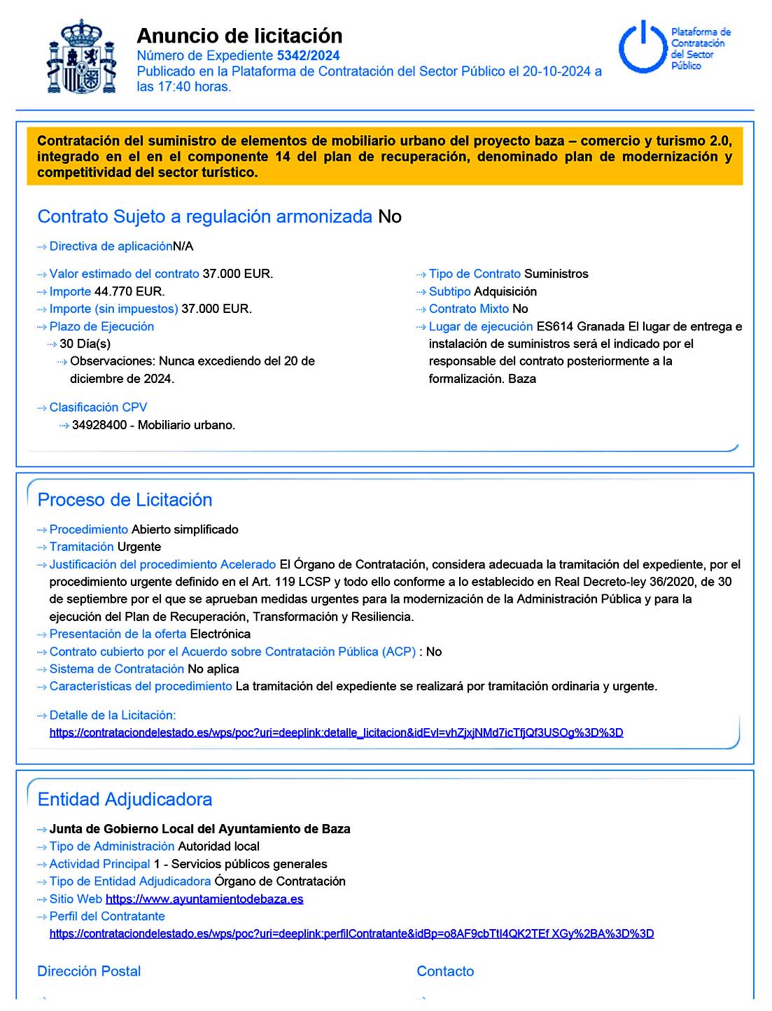 En licitación el suministro de mobiliario urbano para el proyecto Baza-Comercio y Turismo 2.0. Ya se encuentra publicado en la Plataforma de Contratación del Sector Público el anuncio de licitación que rige la contratación del suministro de elementos de mobiliario urbano del proyecto Baza-Comercio y Turismo 2.0, integrado en el componente 14 del Plan de Recuperación, denominado Plan de Modernización y Competitividad del Sector Turístico.