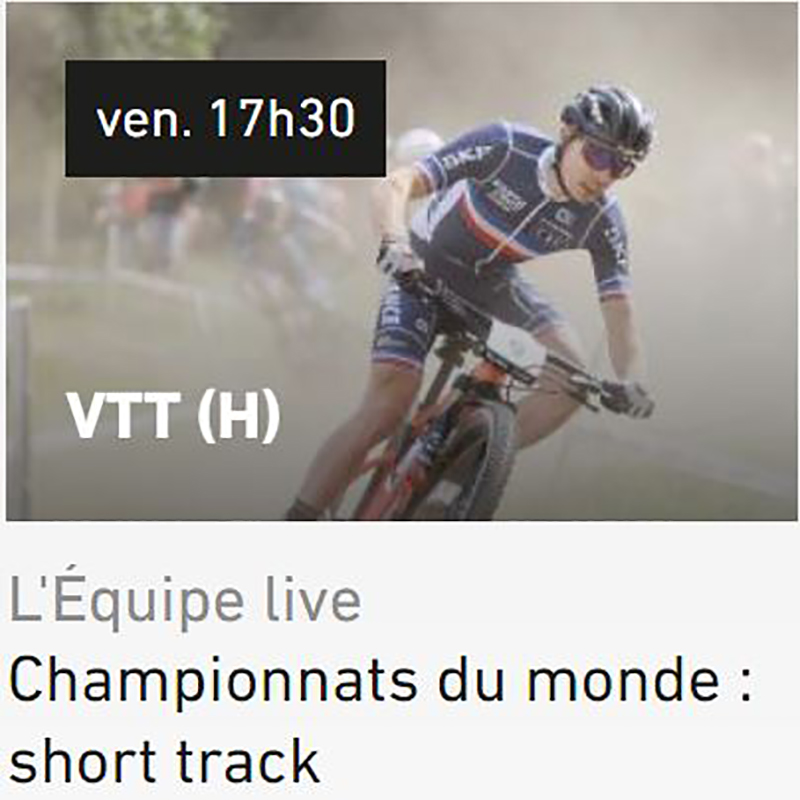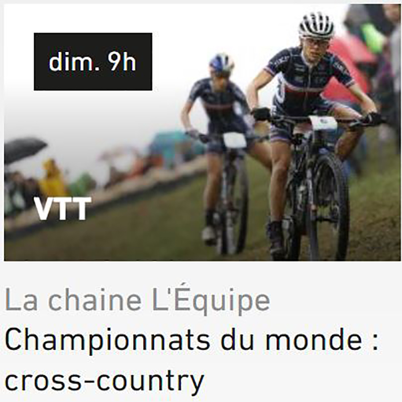 Ya el domingo 28, se emitirán en directo las pruebas femenina y masculina del Campeonato del Mundo de XCO en directo, e igualmente a través del canal L’Équipe y en la web live.lequipe.fr, en horario de 8:55 a. m. – 12:30 p. m. para la categoría Elite femenina y, para la categoría Elite masculina, de 12:50 a 17:35 horas.