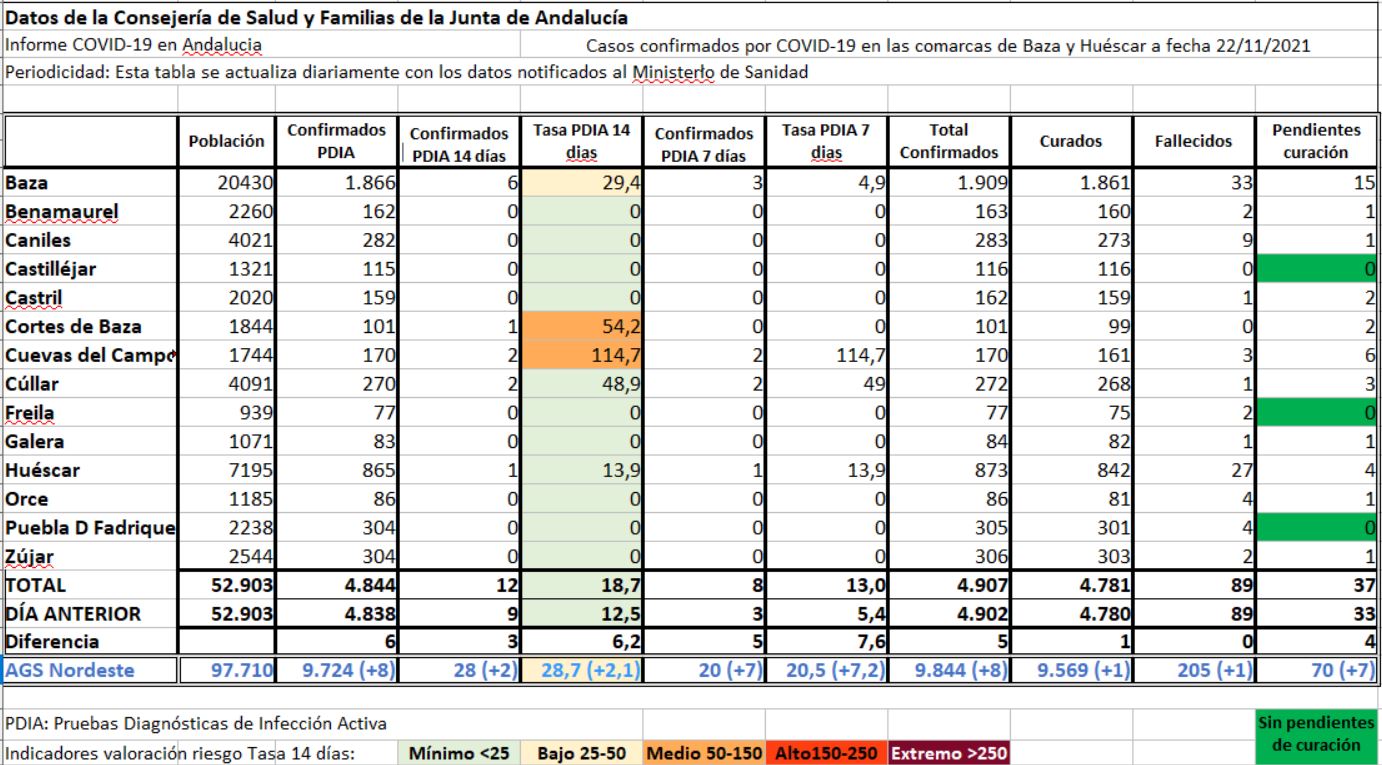 Mientras tanto, la comarca de Huéscar sigue manteniendo sus cifras de los últimos días, con solo un nuevo contagio activo en la capital comarcal y con el resto de municipios con cero confirmados PDIA en los últimos 14 días y tasas de cero casos.