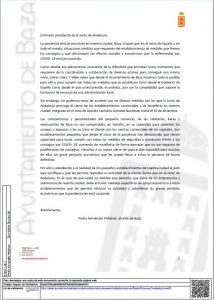 El Ayuntamiento de Baza pide a la Junta de Andalucía la apertura del pequeño comercio y establecimientos de hostelería. El alcalde de Baza, Pedro Fernández, pedía en la mañana de ayer, al presidente de la Junta de Andalucía la apertura de los establecimientos comerciales y de restauración de Baza y la aplicación a estos sectores de las mismas medidas que las establecidas para el resto del territorio de Andalucía.