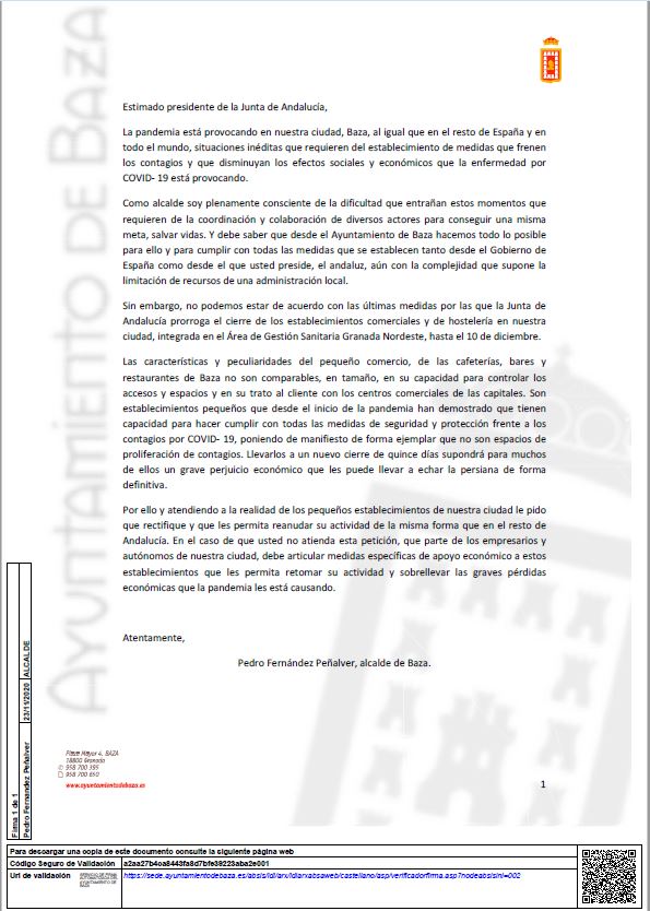 “Las características y peculiaridades del pequeño comercio, de las cafeterías, bares y restaurantes de Baza no son comparables, en tamaño, en su capacidad para controlar los accesos y espacios y en su trato al cliente con los centros comerciales de las capitales. Son establecimientos pequeños que desde el inicio de la pandemia han demostrado que tienen capacidad para hacer cumplir con todas las medidas de seguridad y protección frente a los contagios por COVID- 19, poniendo de manifiesto de forma ejemplar que no son espacios de proliferación de contagios. Llevarlos a un nuevo cierre de quince días supondrá para muchos de ellos un grave perjuicio económico que les puede llevar a echar la persiana de forma definitiva” detalla Fernández y concluye que en “el caso de que usted no atienda esta petición, que parte de los empresarios y autónomos de nuestra ciudad, debe articular medidas específicas de apoyo económico a estos establecimientos que les permita retomar su actividad y sobrellevar las graves pérdidas económicas que la pandemia les está causando”.