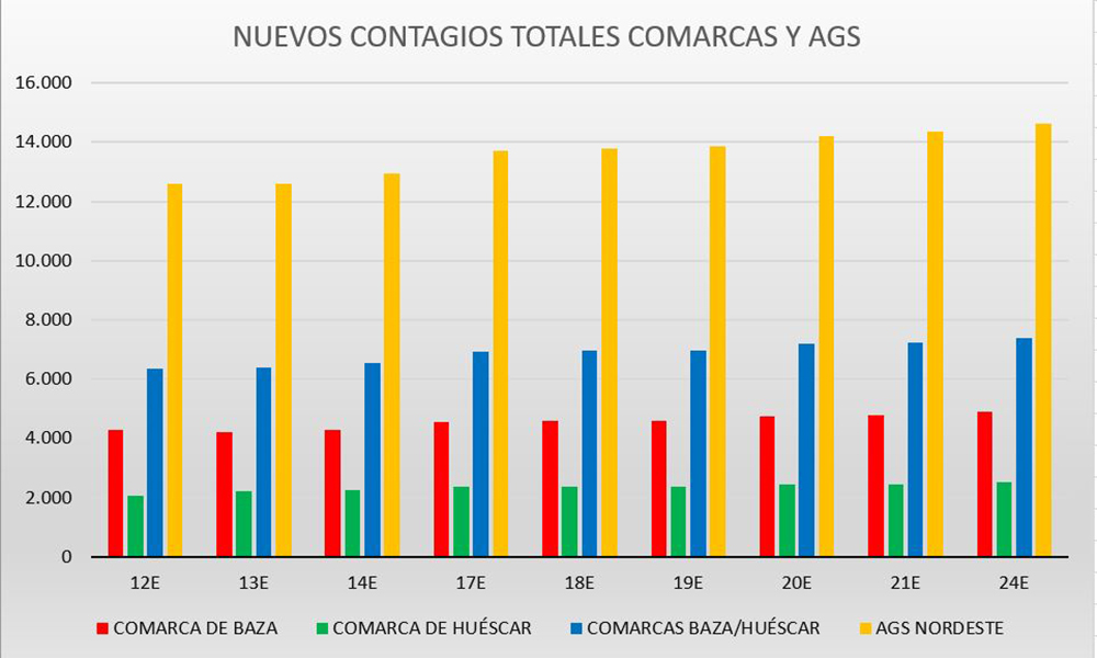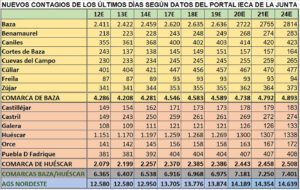 151 casos nuevos en las comarcas de Baza y Huéscar y 285 en el AGS Nordeste de Granada, tras el fin de semana. Por lo que se refiere a las comarcas de Baza y Huéscar, siempre según los datos del Portal IECA de la Consejería de Salud y Familias de la Junta de Andalucía, en el primer parte tras el fin de semana se han registrado 151 casos nuevos de contagio en los 14 municipios que forman las comarcas de Baza y Huéscar, a pesar de lo cual se produce una bajada de la tasa de incidencia a 14 días y una pequeña subida en la de 7 días, siguiendo un poco la pauta de lo acontecido en la mayor parte de municipios.. Las tasas ahora son de 1.852,9 a 14 días y de 727,9 a 7 días, por 100.000 habitantes. Añadir también los 105 enfermos que se han curado y que deja una cifra pendiente de curación de 2.067 y la triste noticia de la notificación de un fallecimiento más en la localidad de Orce.