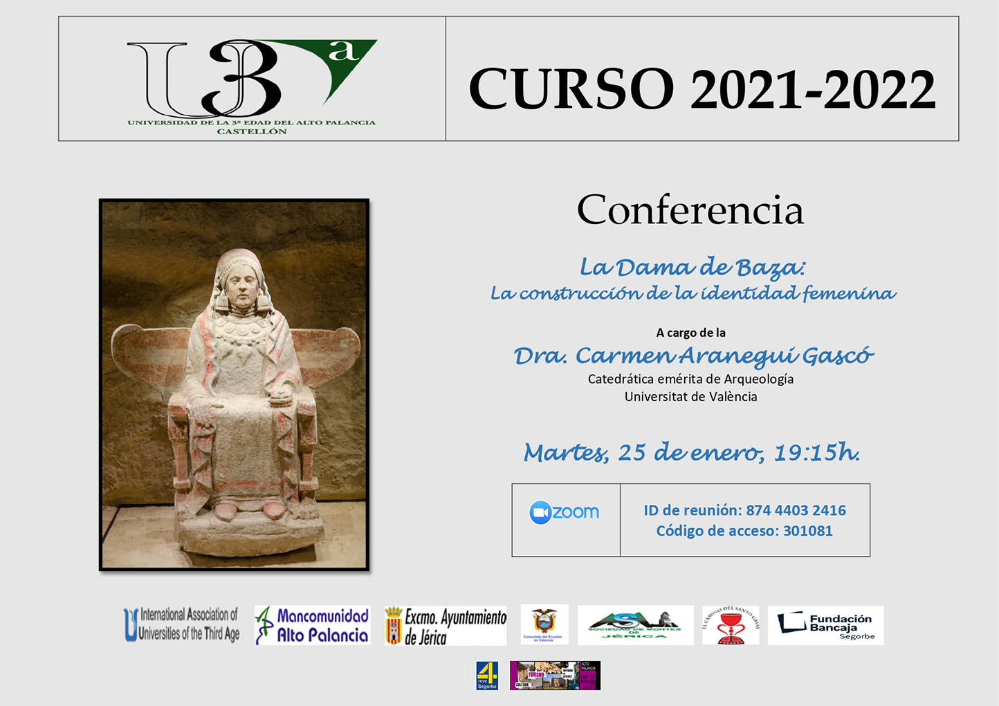 La doctora Carmen Aranegui, quien triunfara con su conferencia en Baza, ofrece otra nueva intervención con la Dama de Baza como centro. «La Dama de Baza: la construcción de la identidad femenina». Ese es el título de la conferencia que la Catedrática Emérita de Arqueología de la Universidad de Valencia Carmen Aranegui ofrece este martes 25 de enero a partir de las 19.15h.
