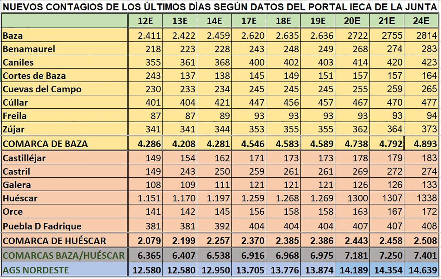 151 casos nuevos en las comarcas de Baza y Huéscar y 285 en el AGS Nordeste de Granada, tras el fin de semana. Por lo que se refiere a las comarcas de Baza y Huéscar, siempre según los datos del Portal IECA de la Consejería de Salud y Familias de la Junta de Andalucía, en el primer parte tras el fin de semana se han registrado 151 casos nuevos de contagio en los 14 municipios que forman las comarcas de Baza y Huéscar, a pesar de lo cual se produce una bajada de la tasa de incidencia a 14 días y una pequeña subida en la de 7 días, siguiendo un poco la pauta de lo acontecido en la mayor parte de municipios.. Las tasas ahora son de 1.852,9 a 14 días y de 727,9 a 7 días, por 100.000 habitantes. Añadir también los 105 enfermos que se han curado y que deja una cifra pendiente de curación de 2.067 y la triste noticia de la notificación de un fallecimiento más en la localidad de Orce.
