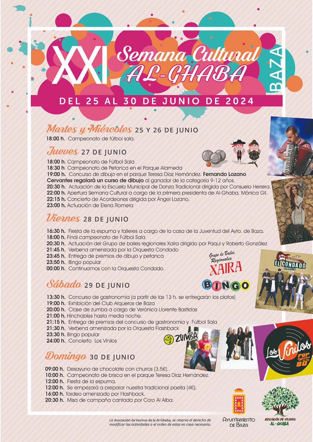Una celebración para la que se ha preparado una extensa programación de actividades dirigidas a todas las edades y para gustos muy diversos, con reclamos deportivos, musicales, culturales y gastronómicos, con los que invitar a vecinos y bastetanos en general a disfrutar con los primeros días del recién estrenado verano bastetano, participando de un programa que incluye los siguientes actos: