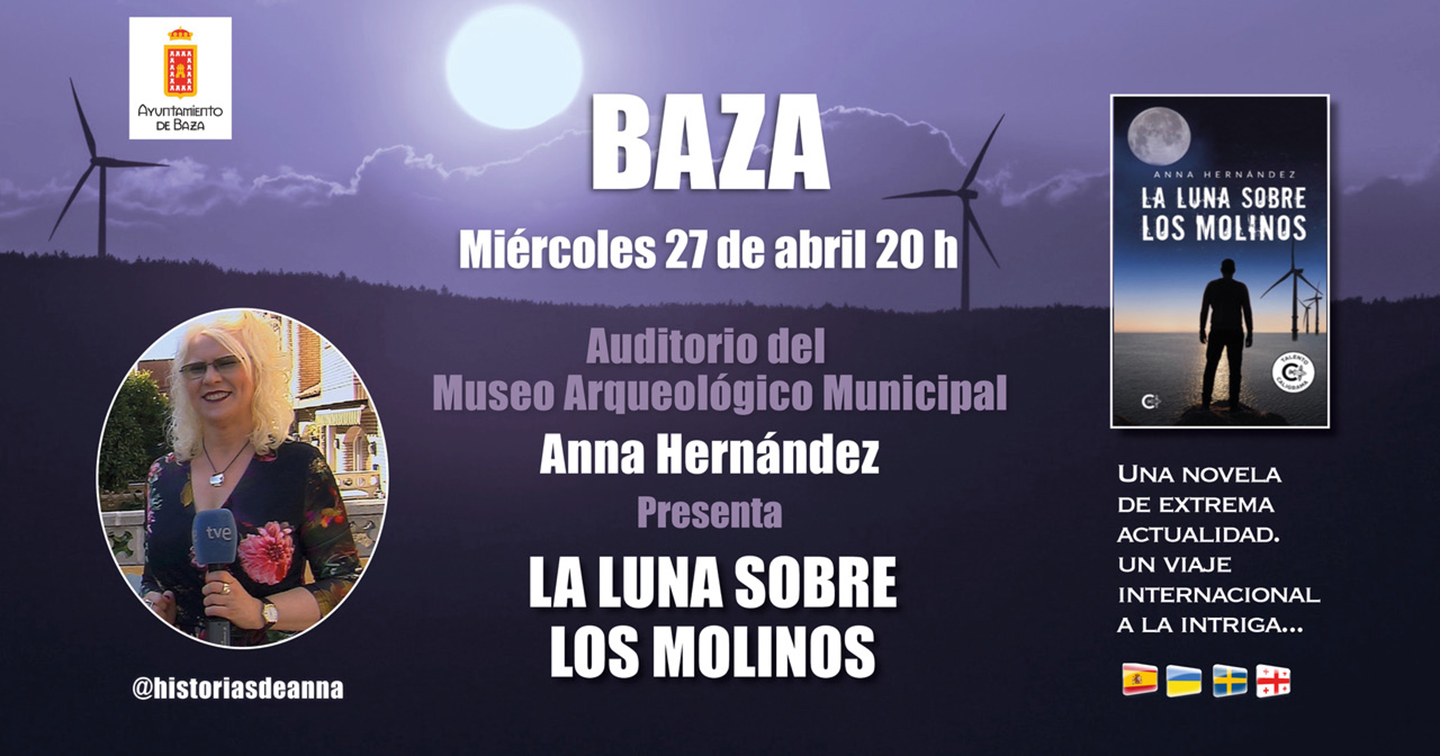 Mañana se presenta en Baza de “La luna sobre los molinos” una obra de la periodista murciana Anna Hernández, reportera del programa España Directo de RTVE. Una presentación que tendrá lugar mañana, miércoles 27 de abril, a las 20,00 horas, en el auditorio del Museo Arqueológico Municipal de Baza.