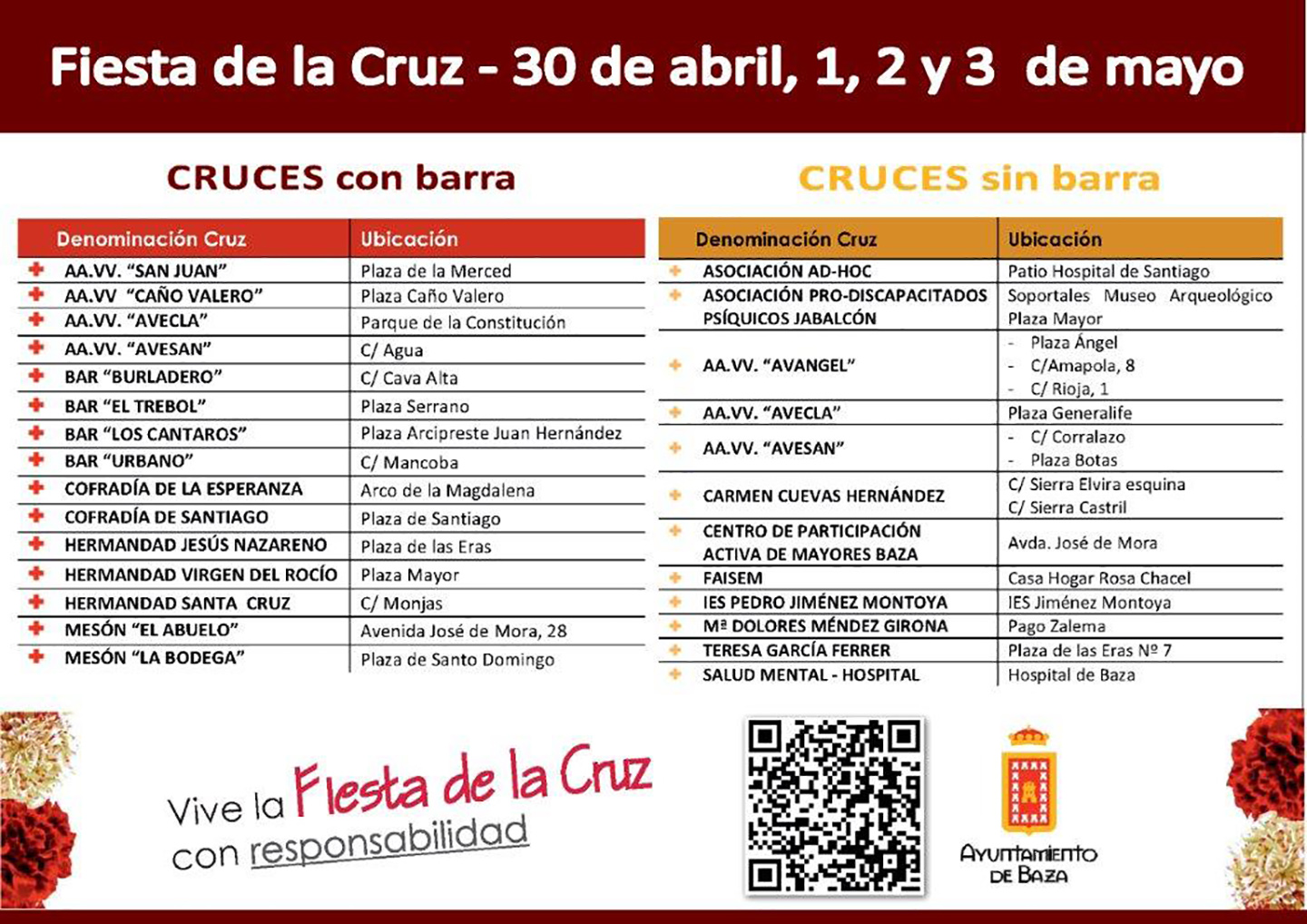 La ciudad se engalanará del 30 de abril al 3 de mayo con una treintena de Cruces en sus diferentes barrios, tanto con barra como sin barra. Además de recorrerlas, los aficionados a las sevillanas podrán disfrutar el domingo 1 de mayo del encuentro de Amantes de las Sevillanas del Geoparque que se desarrollará desde las 11.30 en la Plaza Mayor de Baza con la música en directo del grupo “Somos del Sur”, muy conocido por la participación de sus componentes en el concurso “Yo soy del Sur” de Canal Sur Televisión. Se anima a todo el mundo a vestirse con sus mejores galas para disfrutar bailando en este encuentro.