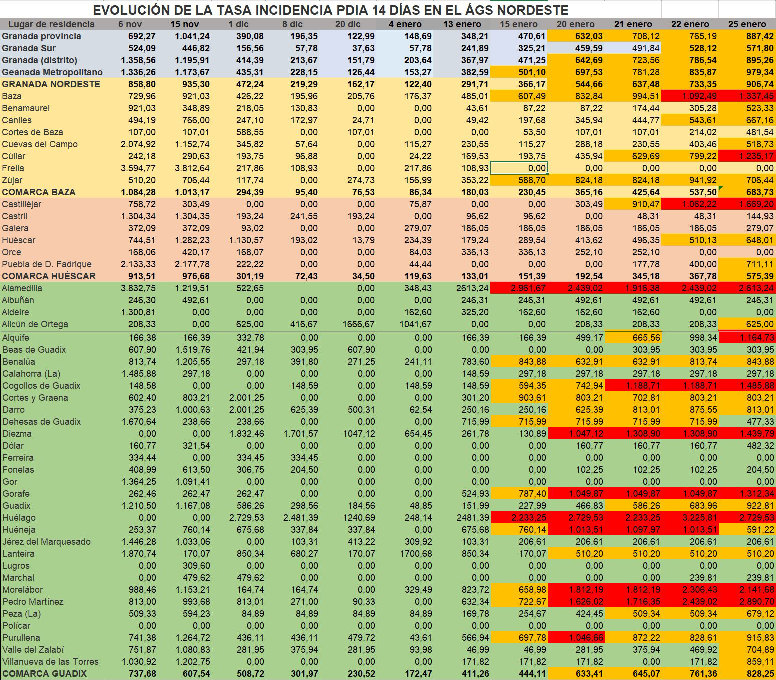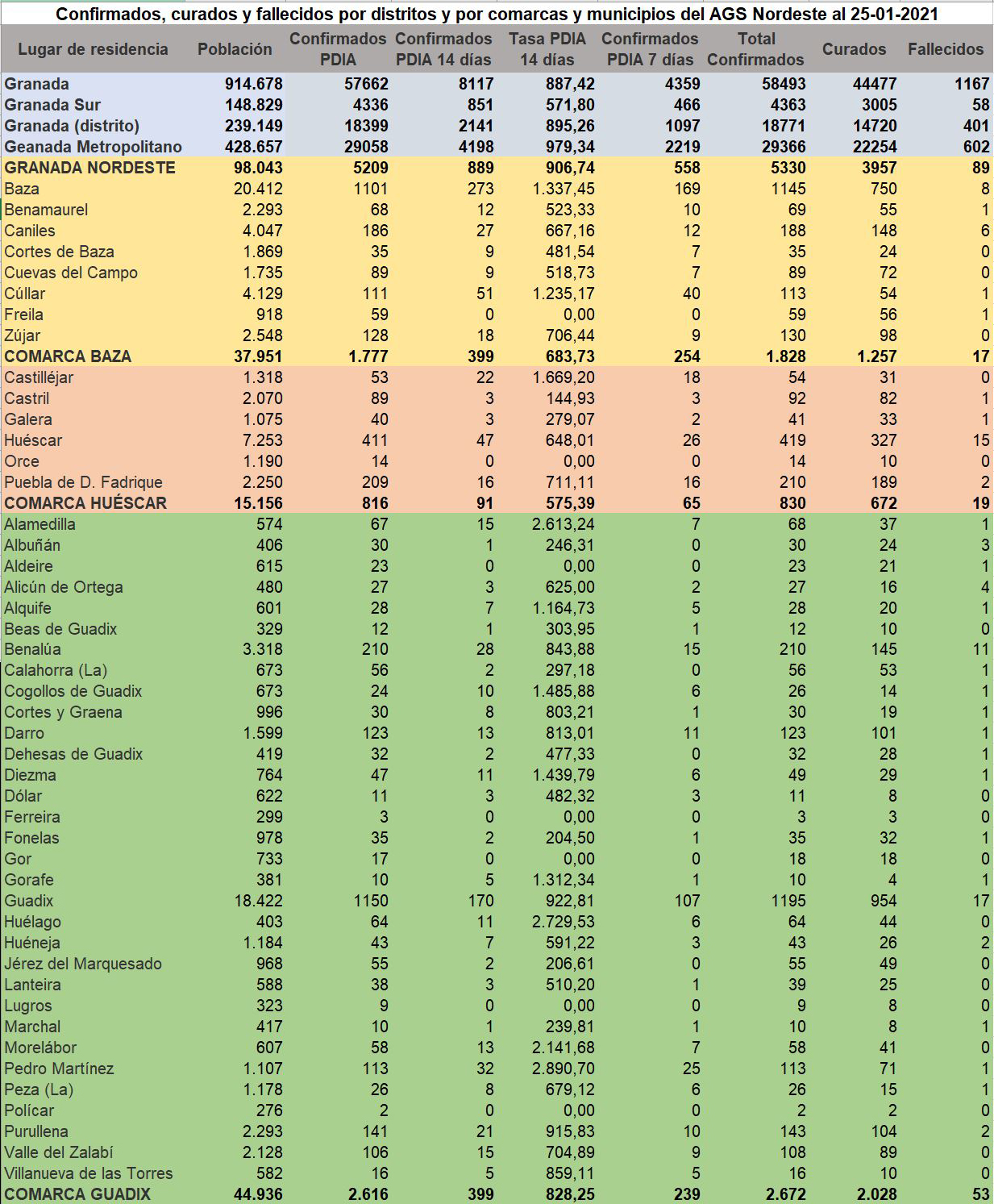 Además, ha habido tres pueblos que han descendido de la tasa de mil contagios por cada 100.000 habitantes, pero seguirán con las medidas más restrictivas: Huéneja, Colomera, Fornes y Torre Cardela, así como otros seis que han bajado de la tasa 500, pero que deben mantener el cierre perimetral: Juviles, Dehesas de Guadix, Albuñuelas, Dúrcal, Quéntar y Salar.