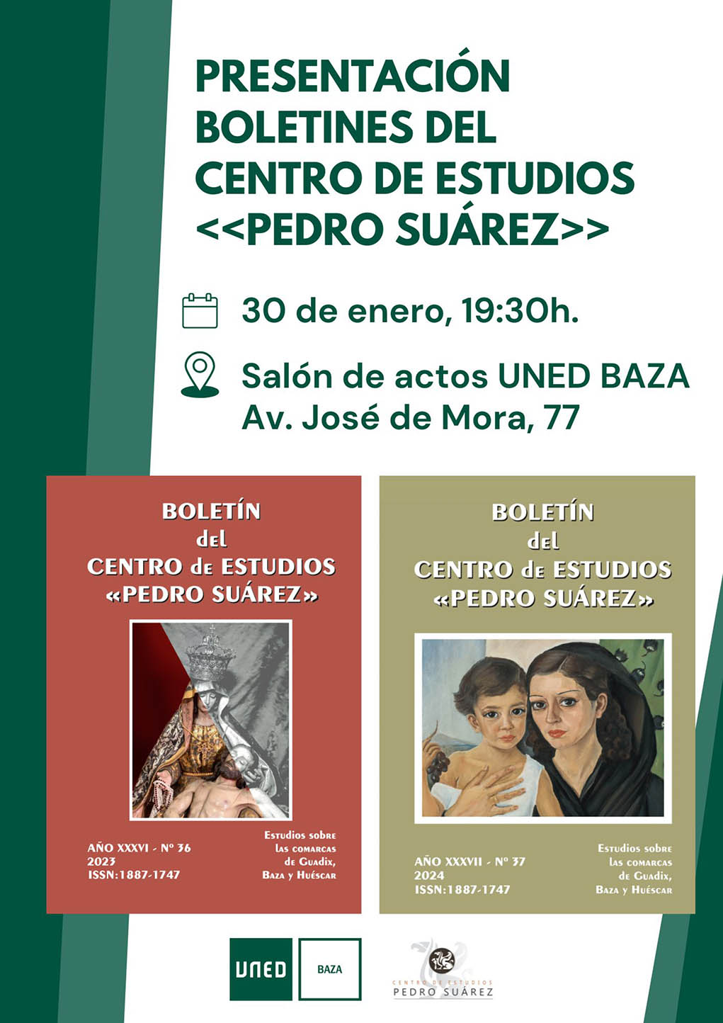La UNED bastetana acoge a presentación de boletines del Centro de Estudios «Pedro Suárez», el próximo jueves. El Centro Asociado a la UNED en Baza acogerá la presentación de los números 36 y 37 del Boletín anual que cada año publica el Centro de Estudios «Pedro Suárez», algo que tendrá lugar el próximo jueves 30 de enero a las 19:30 horas, en el salón de actos de la UNED bastetana, en un acto que estará presidido por el presidente del Centro de Estudios «Pedro Suárez», Juan Manuel Rodríguez Domingo.