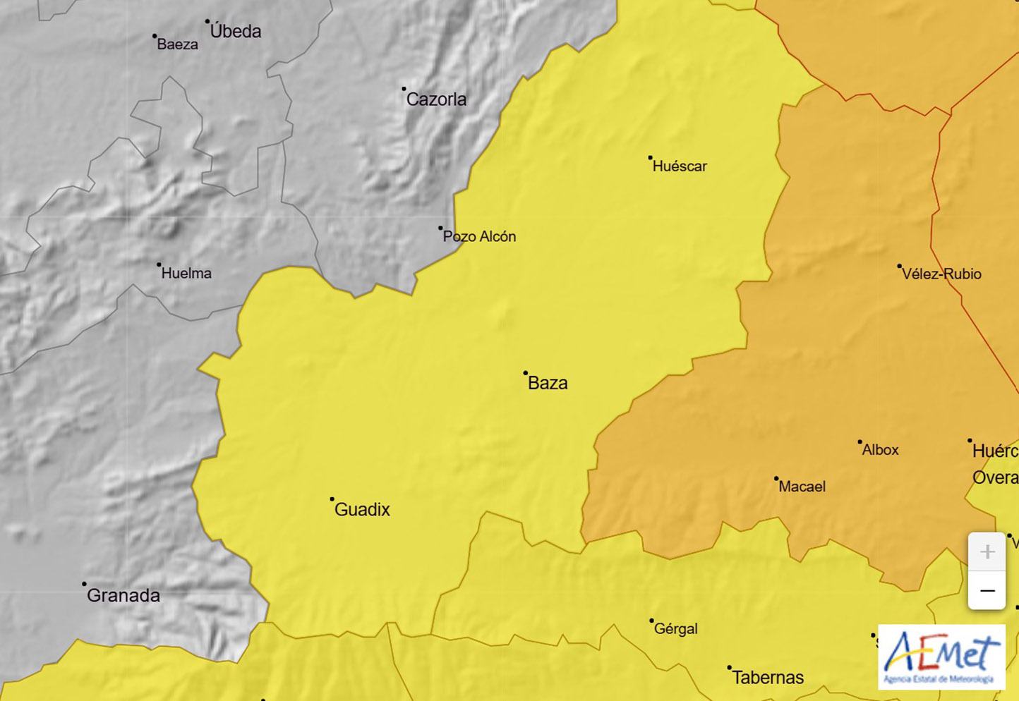 Un aviso que se mantendrá durante todo el martes 28 de enero, con las comarcas de Guadix, Baza, Huéscar y sus alrededores que estarán en riesgo por nevadas en cotas a partir de los 1.200 metros, con un aviso amarillo vigente desde las 00:00 hasta las 23:59 horas. Según las previsiones de la Aemet, las acumulaciones de nieve serían moderadas y podrían alcanzar hasta tres centímetros en 24 horas, por lo que la única zona del municipio bastetano que podría resultar afectada es la del anejo de Baúl y, lógicamente, la Sierra de Baza.