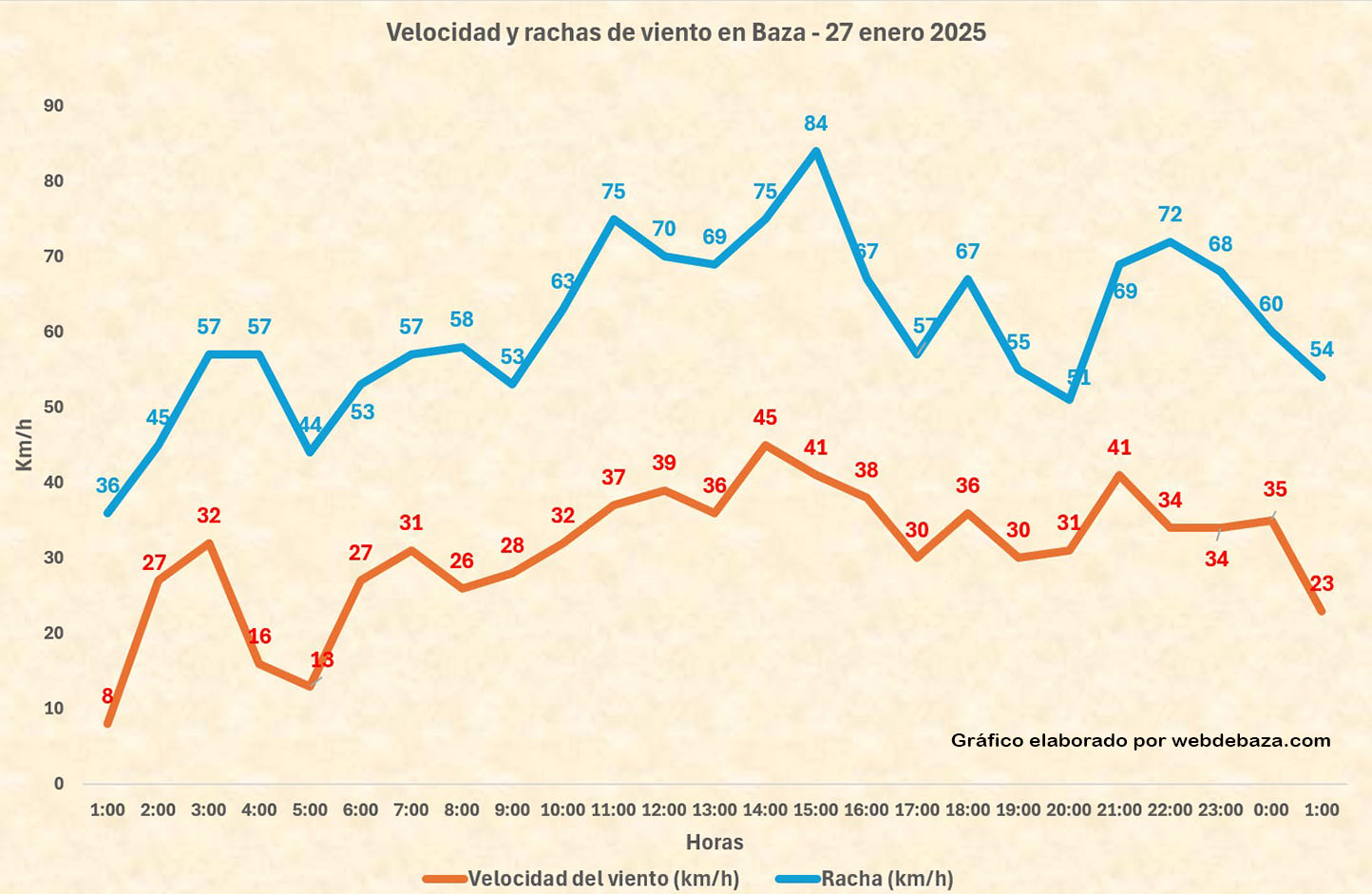 Vientos que ayer se dejaron notar en nuestra provincia y que, en Baza, las rachas llegaron a alcanzar los 84 km/h a las tres de la tarde después de que a partir de las tres de la mañana soplaran estas rachas desde el oeste, con velocidades entre los 50 y 63 km/h., si bien los valores más elevados se produjeron a partir de las 11:00 h. de la mañana y hasta las seis de la tarde con valores que superaron los 70 y hasta los 80 km/h., como queda ya dicho.