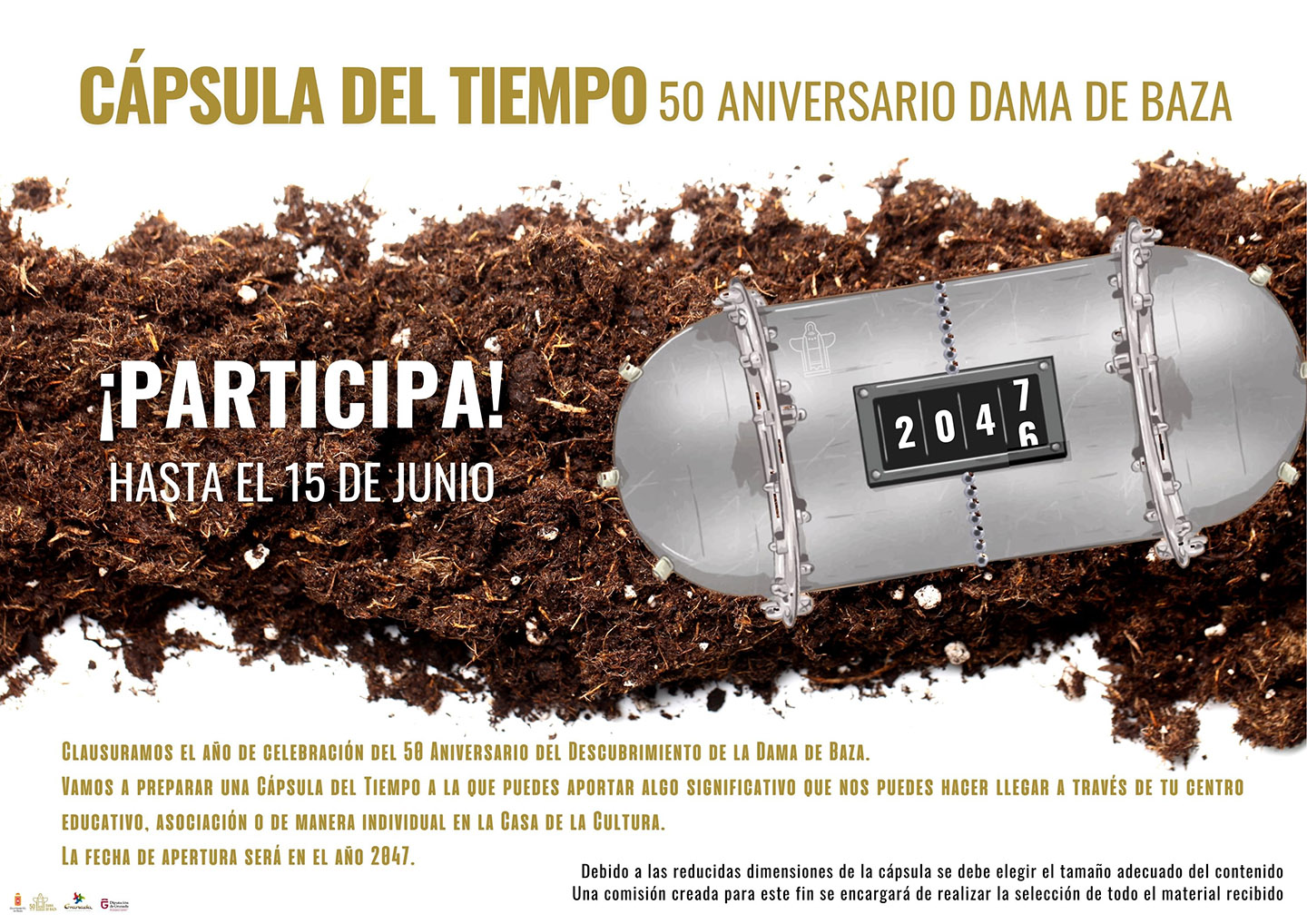 Se amplía hasta el 8 de julio el plazo para participar con contenido en la cápsula del tiempo de la Dama de Baza. Las personas interesadas en participar en la cápsula del tiempo de la Dama de Baza tienen ocasión de aportar su material hasta el próximo 8 de julio. La idea es enviar un mensaje a la ciudad del año 2047, cuando se cumplan 75 años del hallazgo de la Dama.