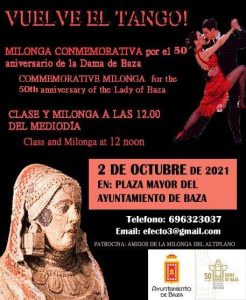 La primera tendrá lugar a las doce del mediodía en la Plaza Mayor, escenario para la vuelta del tango a nuestra ciudad. Allí se ha programado la actividad “Milonga conmemorativa por el 50 Aniversario de la Dama de Baza”, una actividad en la que se unen una clase y el protagonismo de un ritmo tan vivo y marcado como la milonga, con Amigos de la Milonga del Altiplano.