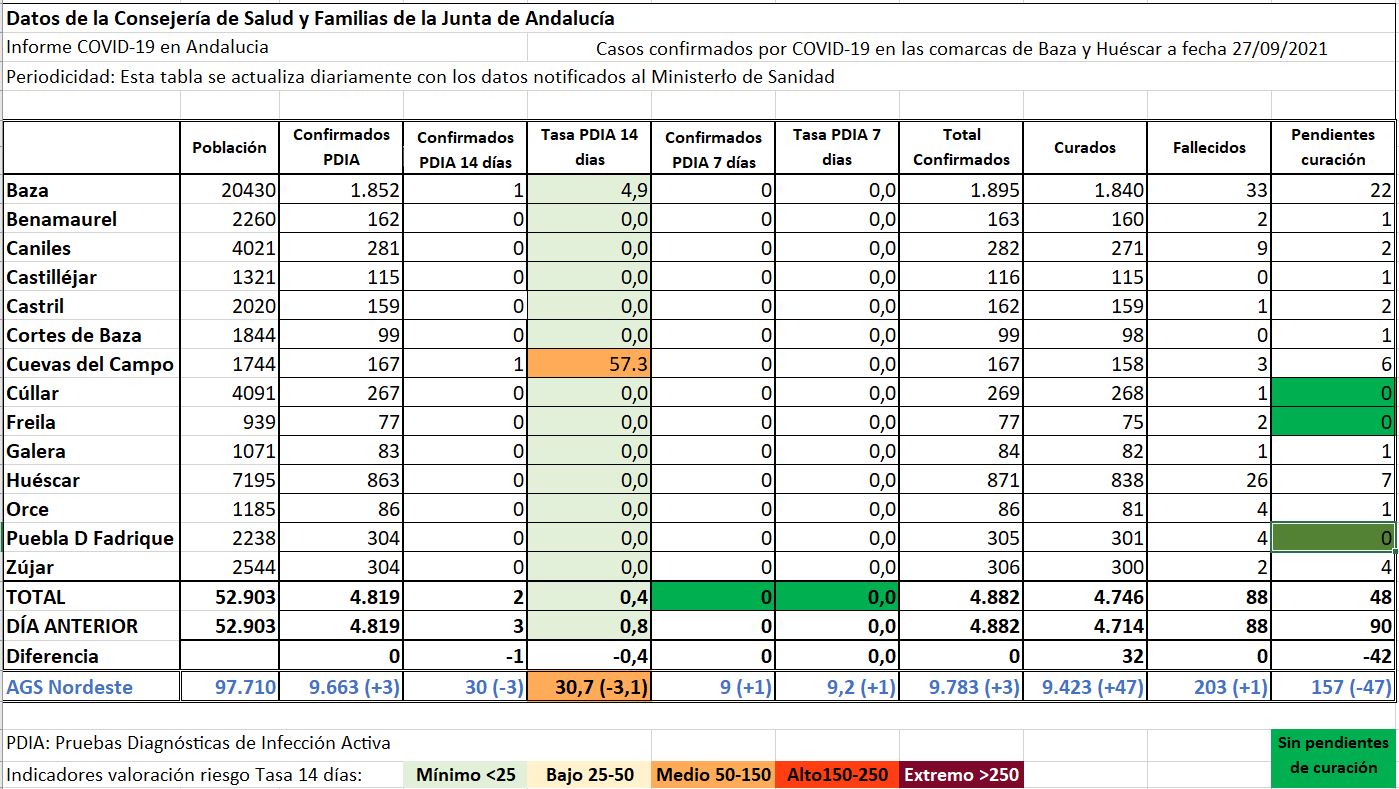 De hecho hay dos aspectos que han seguido mejorando en las últimas horas, como la reducción de los confirmados PDIA a 14 días en Baza, que han pasado de 2 a 1 y el número de curados que, en la última jornada, ha sido de 30, de los que 19 pertenecen a Baza, 4 a Caniles, 3 a La Puebla de don Fadrique, 2 a Huéscar y 1 a Castilléjar y Cuevas del Campo.