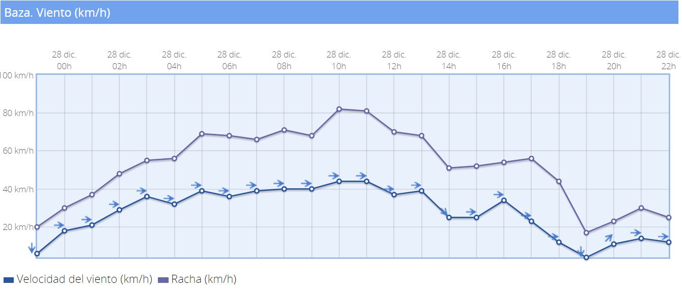 A pocos bastetanos les pasaría desapercibidas las primeras rachas que aparecieron en la noche del domingo al lunes y que, en torno a las dos de la madrugada, alcanzaban ya los 50 km/h. y dejaban sentir el silbido característico de estas situaciones. A partir de esa hora, además, las rachas siguieron subiendo de velocidad y a las cinco de la madrugada ya se llegaba a los 69 km/h., que fueron 71 km/h a las 8 de la mañana y que alcanzaron su velocidad máxima a las 10,00 h., con 82 km/h y una actividad constante, hasta el punto de que una hora más tarde la velocidad se mantenía en 81 km/h.