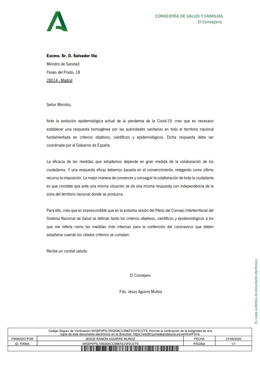 Para ello, Jesús Aguirre ha dirigido una carta, como consejero de Salud y Familias, al ministro de Sanidad del Gobierno de España, Salvador Illa, la cual ha sido publicada en redes sociales por el presidente andaluz, Juanma Moreno, que ha añadido que “la situación de la pandemia está empeorando” y que “el Gobierno de España debe marcar ya unos criterios objetivos para todo el territorio que justifiquen las medidas más intensas”.