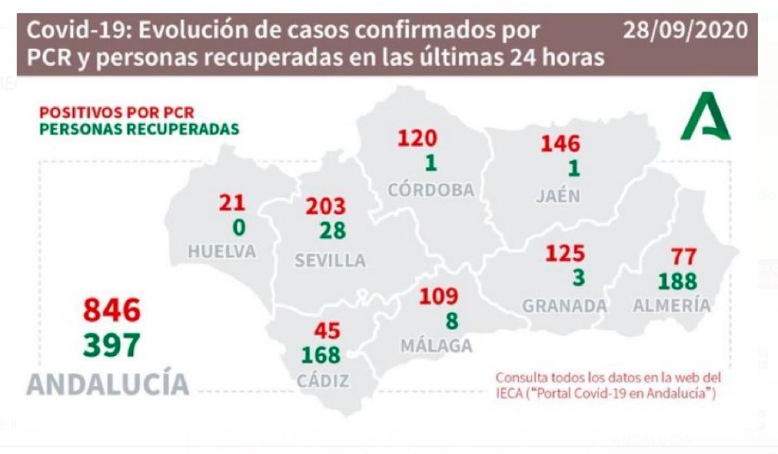 A nivel andaluz, ayer se registraron 17 muertes por coronavirus, 15 más que este domingo, según los datos difundidos por el Instituto de Estadística y Cartografía de Andalucía (IECA), que contabilizan 846 casos confirmados por PCR.