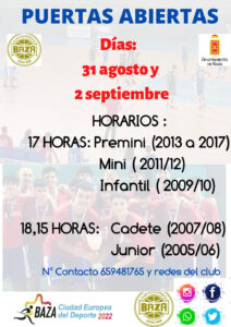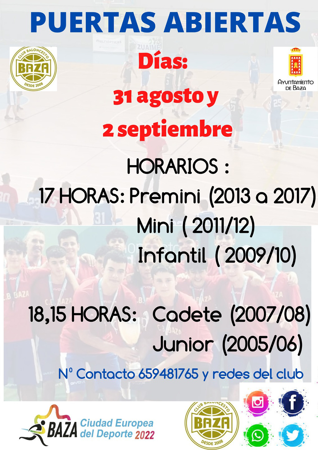 Aprovechando esta presentación, desde el CB Baza se recuerda a todos los interesados que las Jornadas de Puertas Abiertas para la cantera tendrán lugar este miércoles 31 agosto y el viernes 2 septiembre, por lo que se espera que acudan a probar, y a recibir toda la información para la próxima temporada, todas las personas interesadas que lo deseen y sin ningún compromiso, en las categorías Premini, Mini, Infantil, Cadete y Junior, quienes también pueden consultar cualquier duda que se les presente en el teléfono 659 48 17 65.