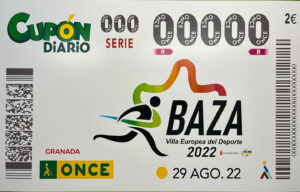 Cinco millones de cupones de la ONCE llevaron, ayer lunes 29 de agosto, la imagen de Baza como Villa Europea del Deporte por toda España. El cupón de la ONCE que se vendió ayer, lunes 29 de agosto, en el que era protagonista Baza y el distintivo que la reconoce como Ciudad Europea del Deporte durante este 2022.