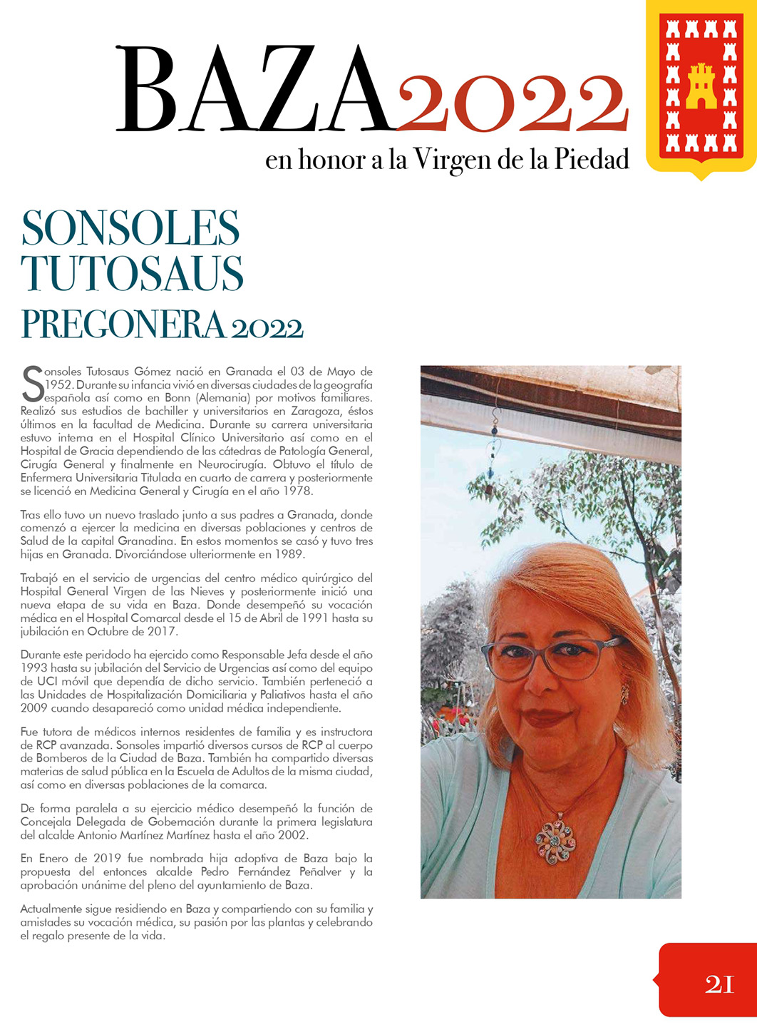 Nombrada hija adoptiva de Baza en 2019, asume el reto de pregonar la Feria y Fiestas con ilusión y respaldada por el cariño de la ciudad en la que sigue residiendo y compartiendo con su familia y amistades “su vocación médica, su pasión por las plantas y celebrando el regalo presente de la vida”.