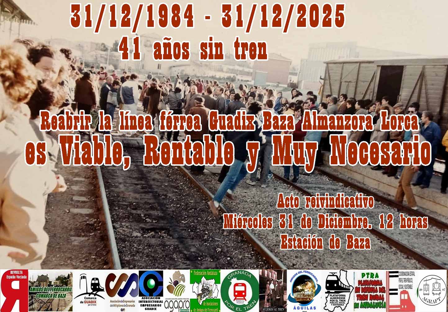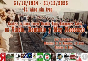 El acto se celebra bajo el lema “31/12/1984-31/12/2025. 41 años sin tren. Reabrir la línea férrea Guadix-Baza-Almanzora-Lorca es viable, rentable y muy necesario”, en referencia al cierre de esta infraestructura ferroviaria y a la reivindicación de su recuperación como elemento clave para el desarrollo económico y social de las comarcas afectadas.