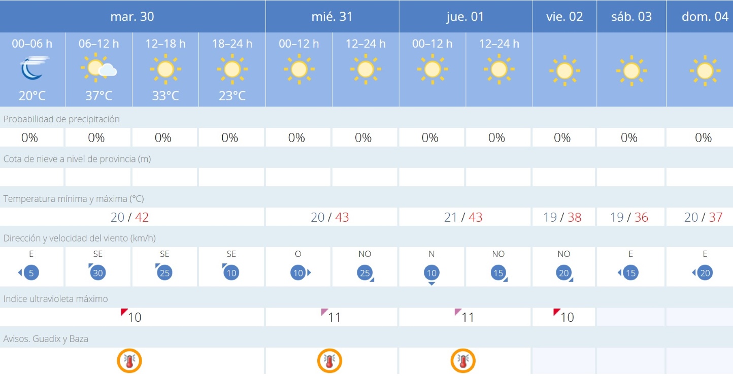 Esta situación ha motivado también que el Centro de Coordinación de Emergencias (Cecem 112), servicio adscrito a la Junta de Andalucía, incluya a nuestra ciudad y a las comarcas del norte granadino en sus recomendaciones de extremar la precaución durante la jornada de este martes en la que está previsto activar de nuevo el aviso naranja por calor en comarcas de Jaén y Granada. Aviso que seguirá vigente mañana martes en la comarcas de la Cuenca del Genil y en Cazorla y Segura (Jaén), y se extenderá también a Guadix y Baza, entre las 13:00 y las 21:00 horas.