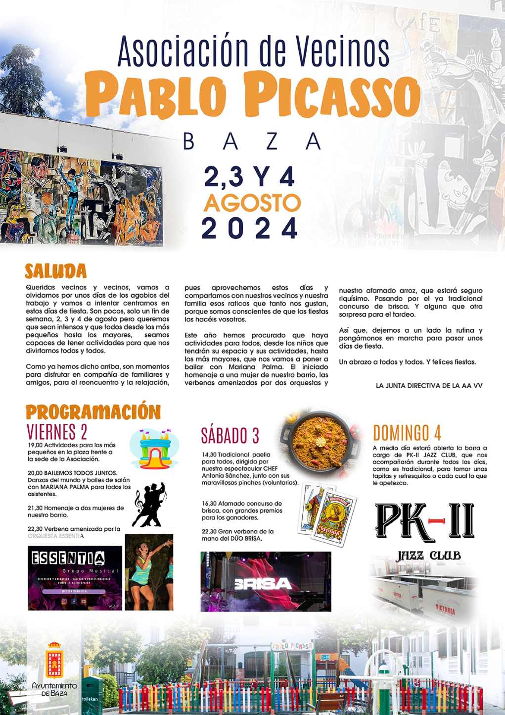 Los vecinos del barrio Pablo Picasso celebran sus fiestas los días 2, 3 y 4 de agosto. La asociación de vecinos del barrio Pablo Picasso abre la programación festiva del mes de agosto en nuestra ciudad con sus fiestas populares, a las que invitan a todos los paisanos e incluso a los amigos de la comarca que quieran acompañarlos.
