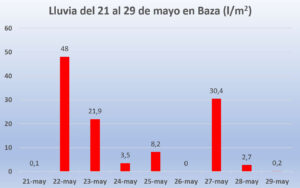 Curioso, que el domingo 21 de mayo se recogieran en Baza un registro de 0,1 l/m2, que de nada servía, pero que precedió a los 48 litros caídos en las siguientes 24 horas y los 21,9 del martes 23 de mayo. A eso se añadían otros 3,5 el miércoles y 8,2 el jueves que, siempre bienvenidos, seguían sumando. No llovió el día 26, pero el sábado 27 se dejaban caer otros30,4 l/m2, lo que se complementaba con otros 2,7 y 0,2 litros caídos el 28 y 29 de mayo, respectivamente.