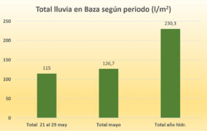 En los últimos nueve días de mayo ha llovido en Baza la mitad del agua caída desde el inicio del año hidrológico que se iniciaba. Como bien conocen nuestros lectores, el año hidrológico no coincide con el año natural, ya que se inicia el 1 de octubre y termina el 30 de septiembre, coincidiendo también con una época de finalización de tareas agrícolas que hacen de esta palabra el término con el que se suele apellidar a ese mismo ciclo, en lugar de meteorológico o hidrometeorológico.