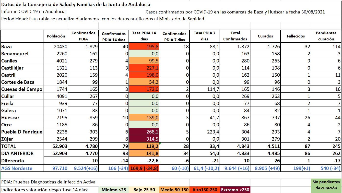 Pero donde las bajadas fueron mayores fue en los datos a 7 días en Caniles, Cortes de Baza, Huéscar, Puebla de don Fadrique y Zújar, hasta el punto de que los dos primeros municipios ponían su tasa a cero, mientras que Cuevas del Campo modificaba su nivel sanitario pasando de “extremo” a “alto” y Huéscar hacía lo mismo dejando el nivel “alto” para pasar a “medio”